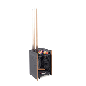 A cue rack built for the elements. With weather-resistant materials and wheels for easy placement, the Mou Floor Cue Rack Covered Outdoor keeps cues, balls, chalk, and triangle tidy in covered outdoor spaces.