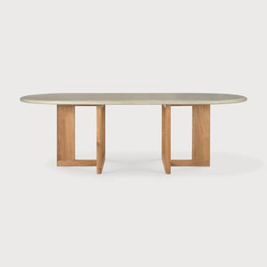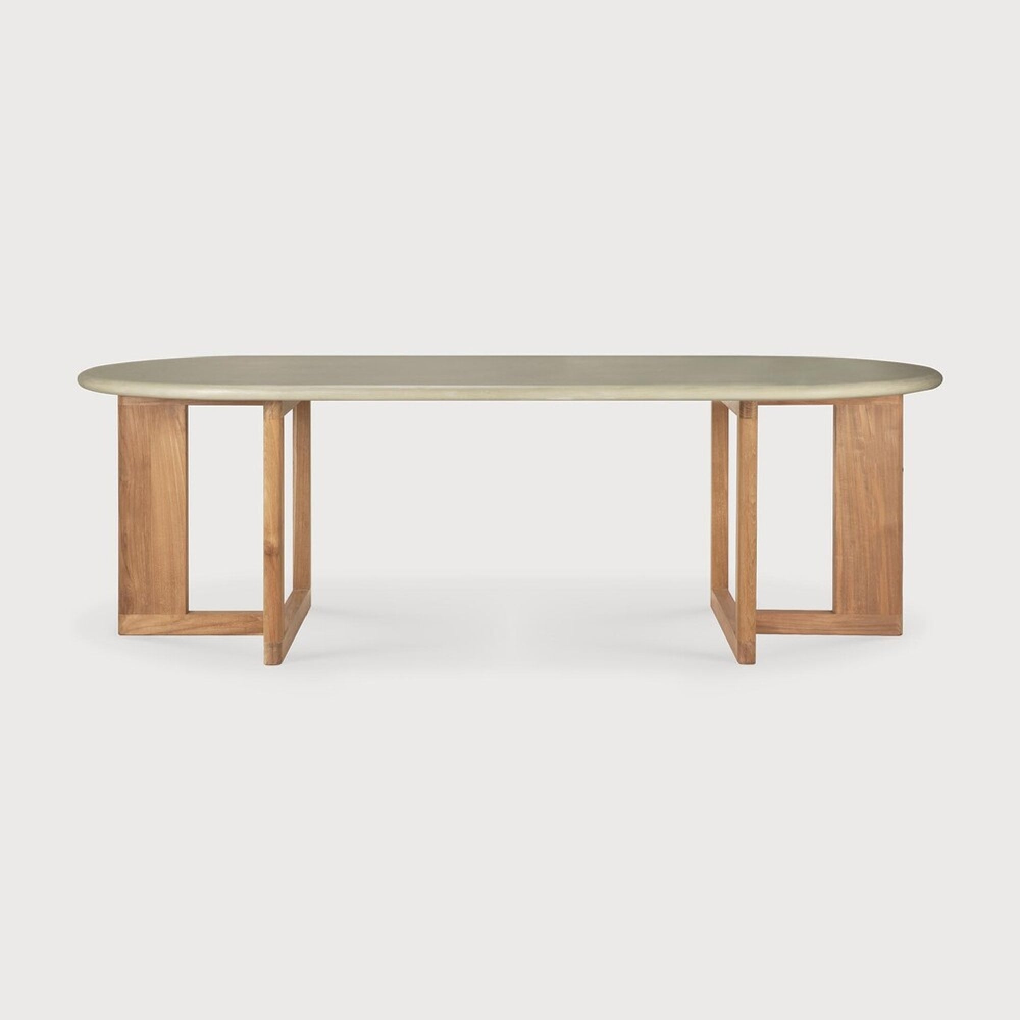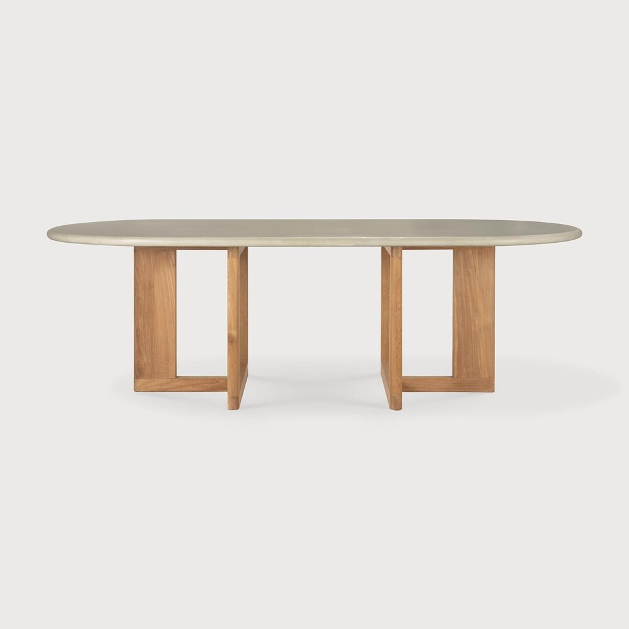 Experience the perfect blend of modern sophistication and natural beauty with this outdoor dining table. This exquisite piece features a sleek, oblong-shaped concrete top, expertly paired with a solid reclaimed teak base. Both materials are renowned for their exceptional strength and resilience, making this table a durable and stylish addition to any space. The rich, warm wood grain of the teak beautifully complements the smooth concrete, creating a harmonious and inviting aesthetic.