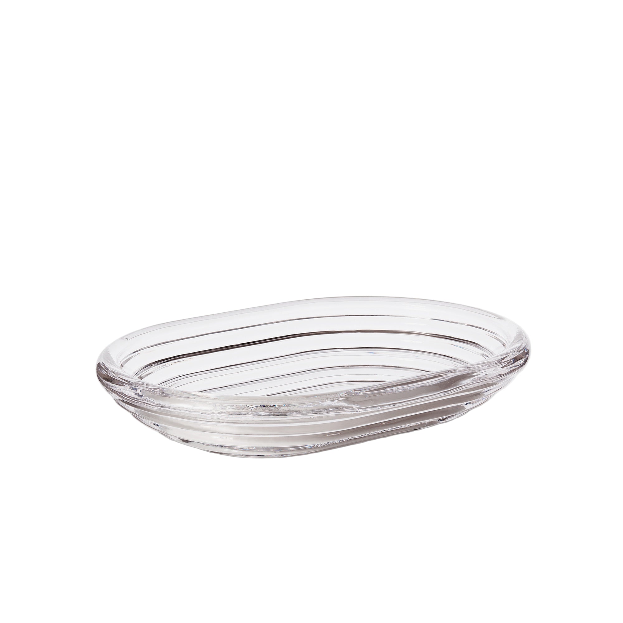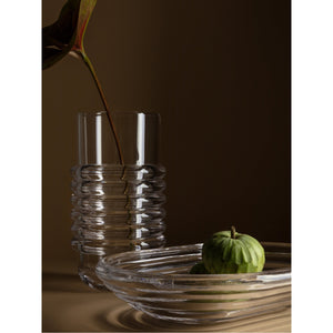 Press bowls by Tom Dixon are designed to catch and refract light, casting eye-catching shadows. The heavyweight grooved bowl is made of chunky coils of pure glass. Bold in silhouette and simple in function, it is manufactured by dropping big globs of molten glass and pressed in iron moulds.