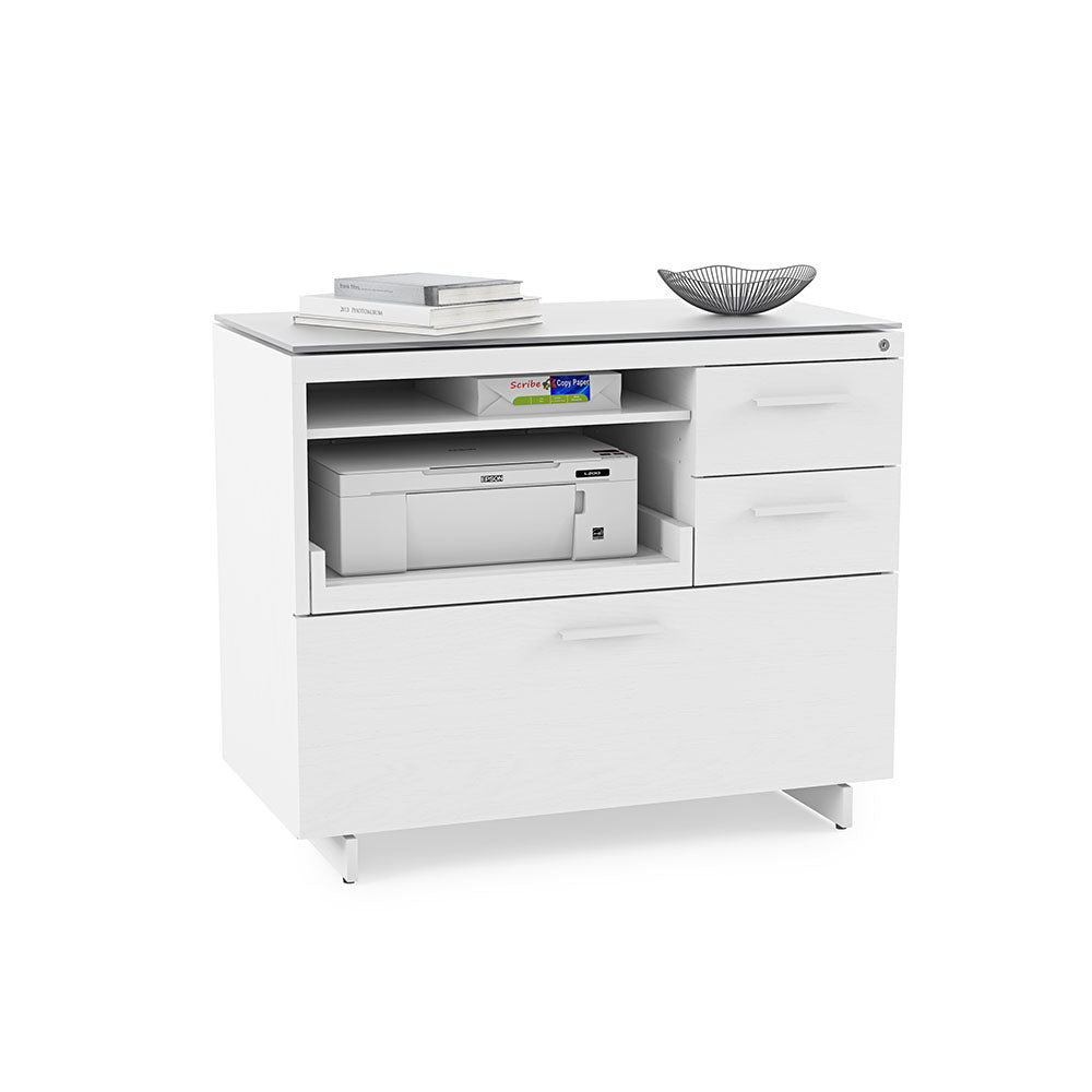 Making the most out of a compact space, this cabinet combines a lateral file drawer with a sliding printer shelf and two storage drawers, keeping everything conveniently within reach.