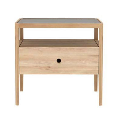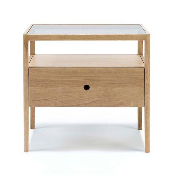 With its one drawer, open space and slightly tapered legs, the Spindle bedside table is the perfect no-nonsense companion for the striking Spindle bed. Available in solid oak.