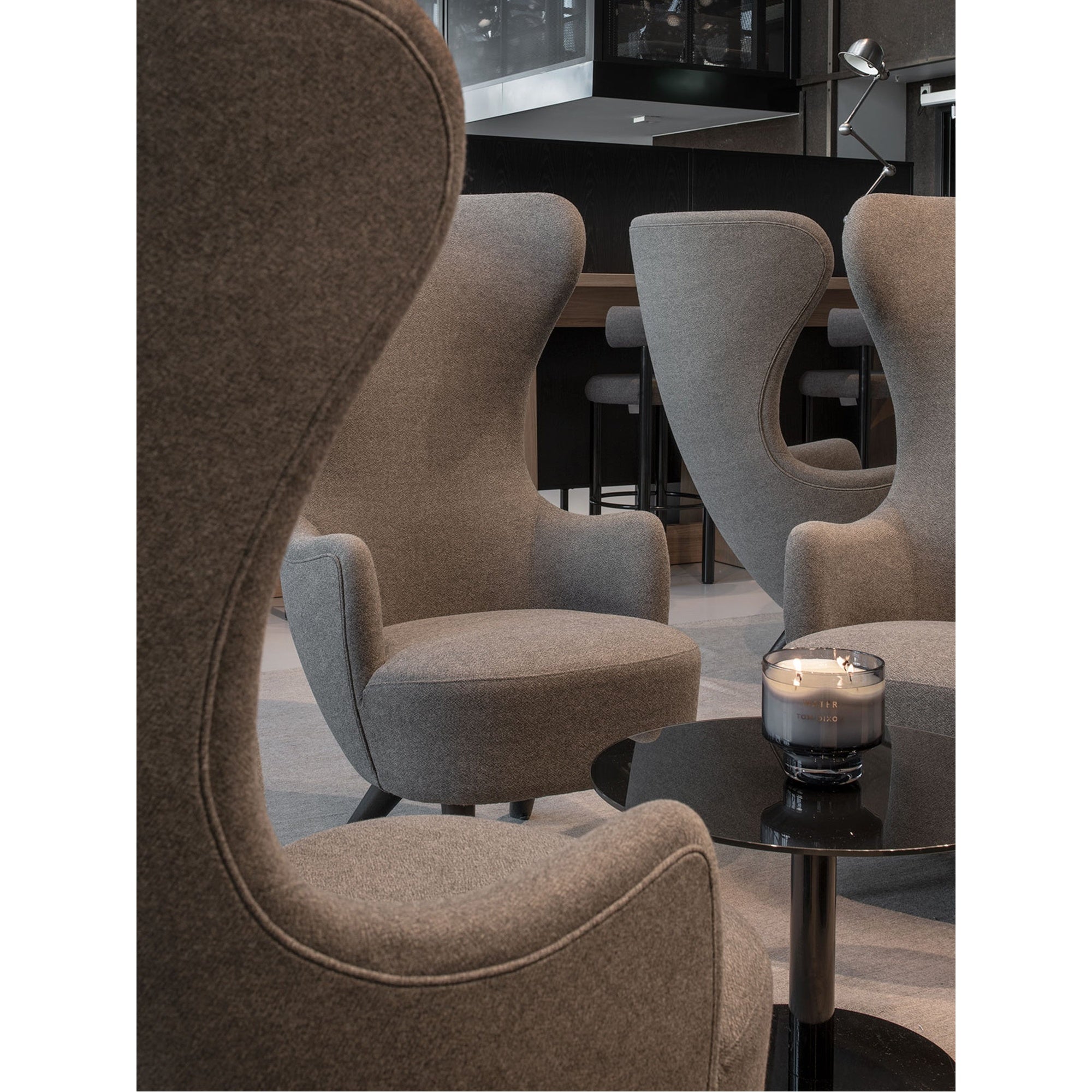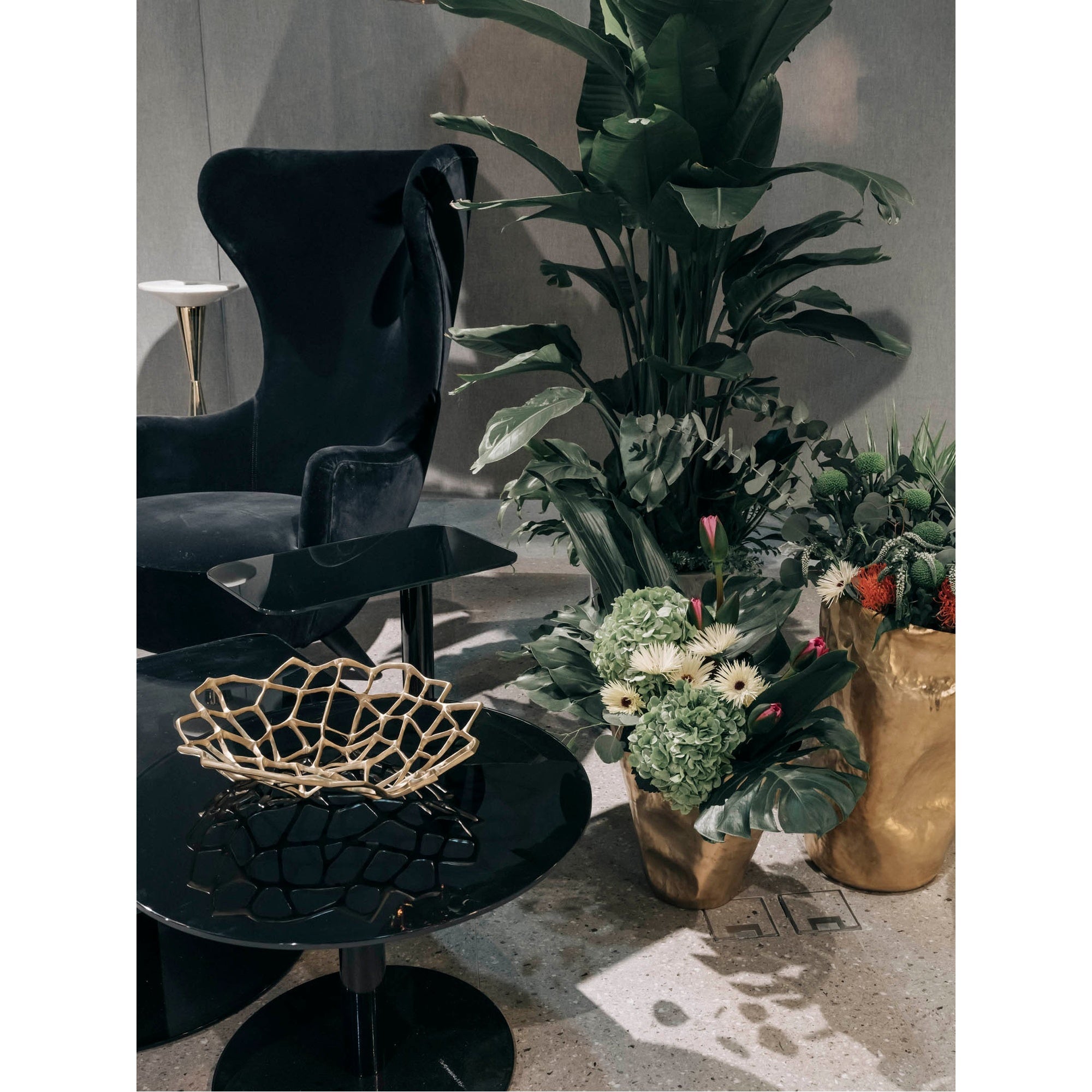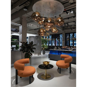 The flash circle side table by Tom Dixon features a modern, round design with an all-black finish and a stunning primavera marble top. Its highly reflective mirrored glass surface creates the illusion of space, bouncing light across the room. Stylish, functional, and fully contract compliant for professional settings.