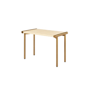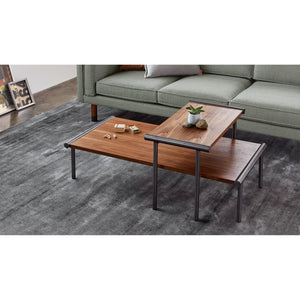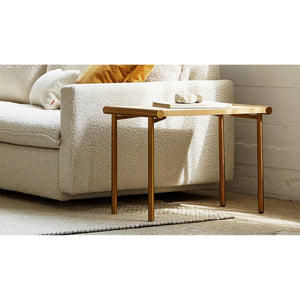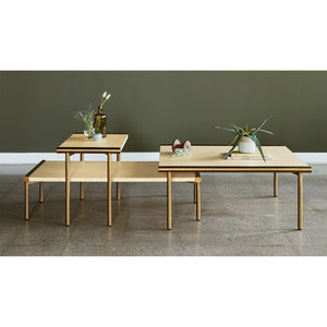 Bauhaus industrial design gets a contemporary update with the GUS* Modern's Manifold collection. Featuring elegant, clean-lined tables that can stand alone or nest together, the well-considered silhouettes optimize space with innovative design compatibility. Featuring natural wood and steel elements, this sleek end table stands as the perfect side-kick to sofas, sectionals, beds and chairs. While the tabletop provides space to spread out, the slender metal legs contribute to an overall light, sleek aesthetic. Available in two combinations - Blonde Ash with Brass or Walnut with Pewter – each with the promise to elevate your space.