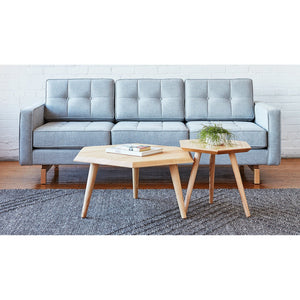 The Metric Coffee Table by GUS* Modern is a minimalist, geometric accent, crafted with solid Walnut or Ash. The hexagonal top features a beveled edge and is designed to nest with the Metric End Table.