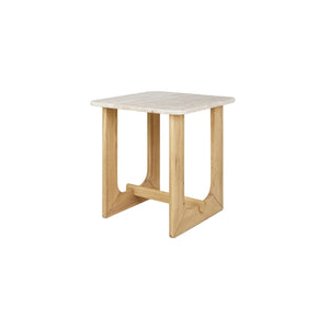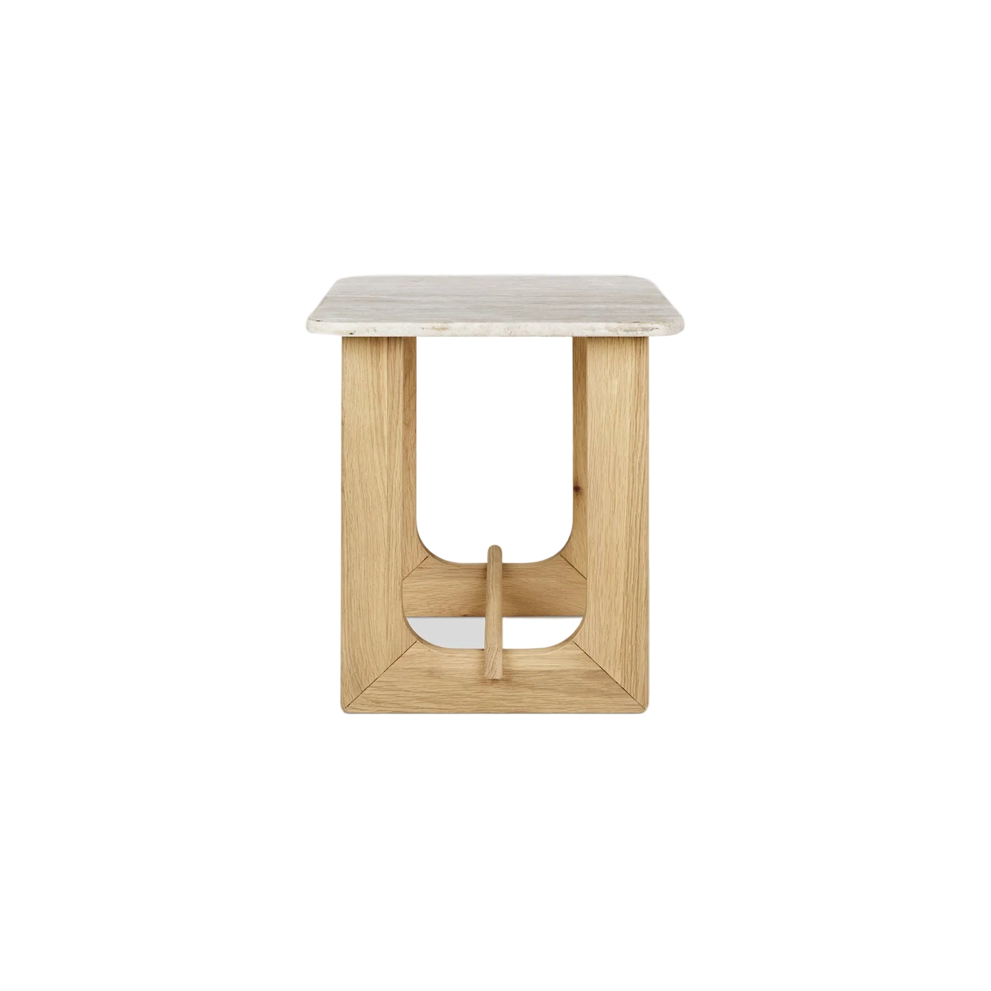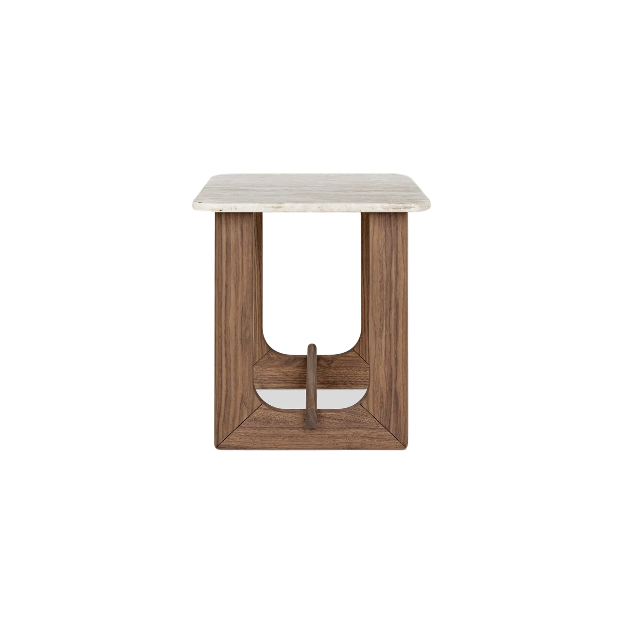 The Portico End Table by GUS* Modern showcases an alluring travertine slab surface and elegantly crafted solid wood base in Walnut or White Oak. The warm, natural travertine grain creates an organic beauty that is unique to each design, reinforced by gently curved corners. These curves are mirrored in the base - with graceful forms and thoughtful proportions that blend the materials into a unified, sculptural accent. Portico is also available as a Coffee Table in square or rectangular size.