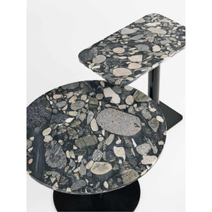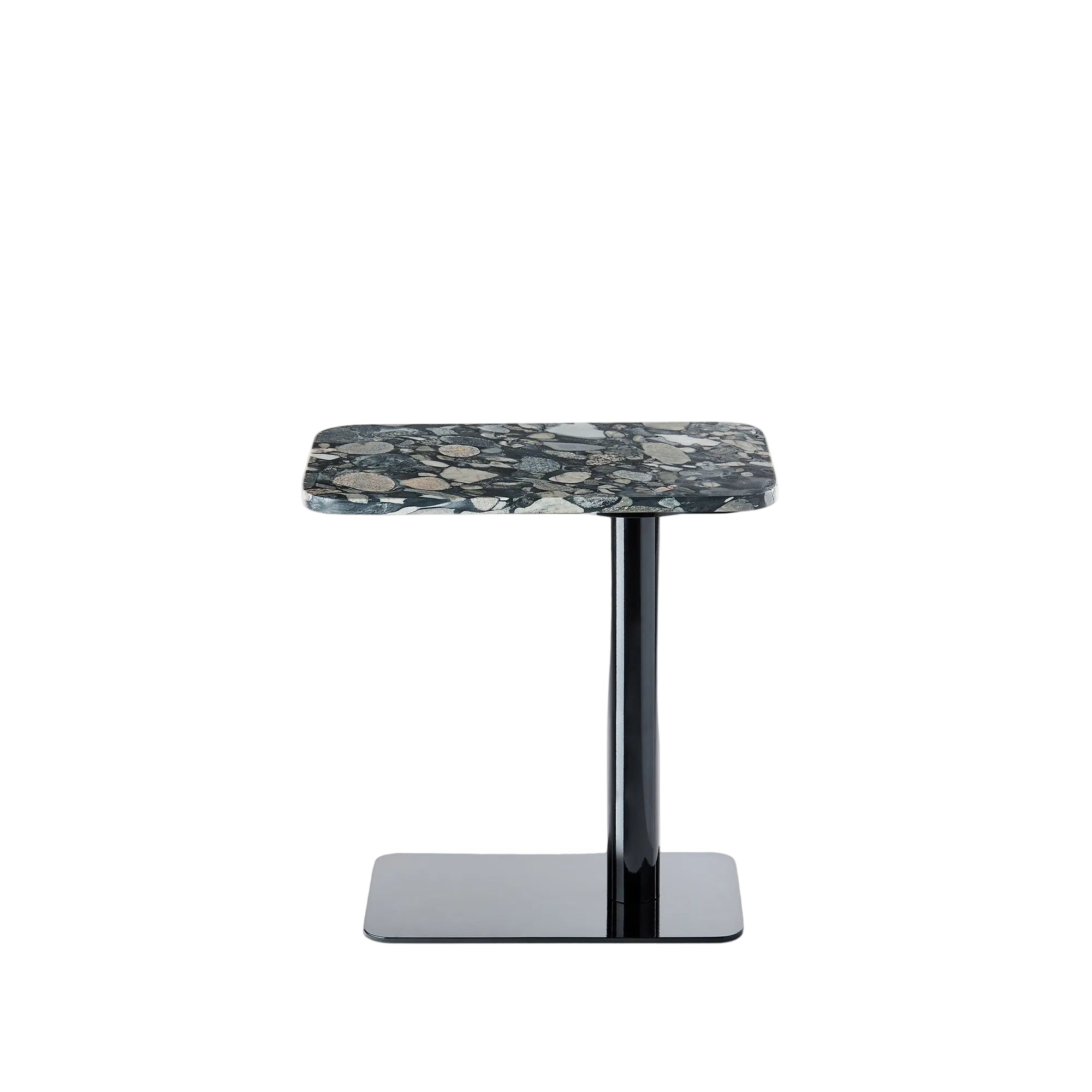 The rectangle stone table by Tom Dixon is a modern rectangular side table featuring a glossy black base and a stone top made from colorful marble mined in the Shandong and Fujian provinces of China. The natural marble's pattern is shaped by crustal movements during lava extrusion, developed over millions of years.