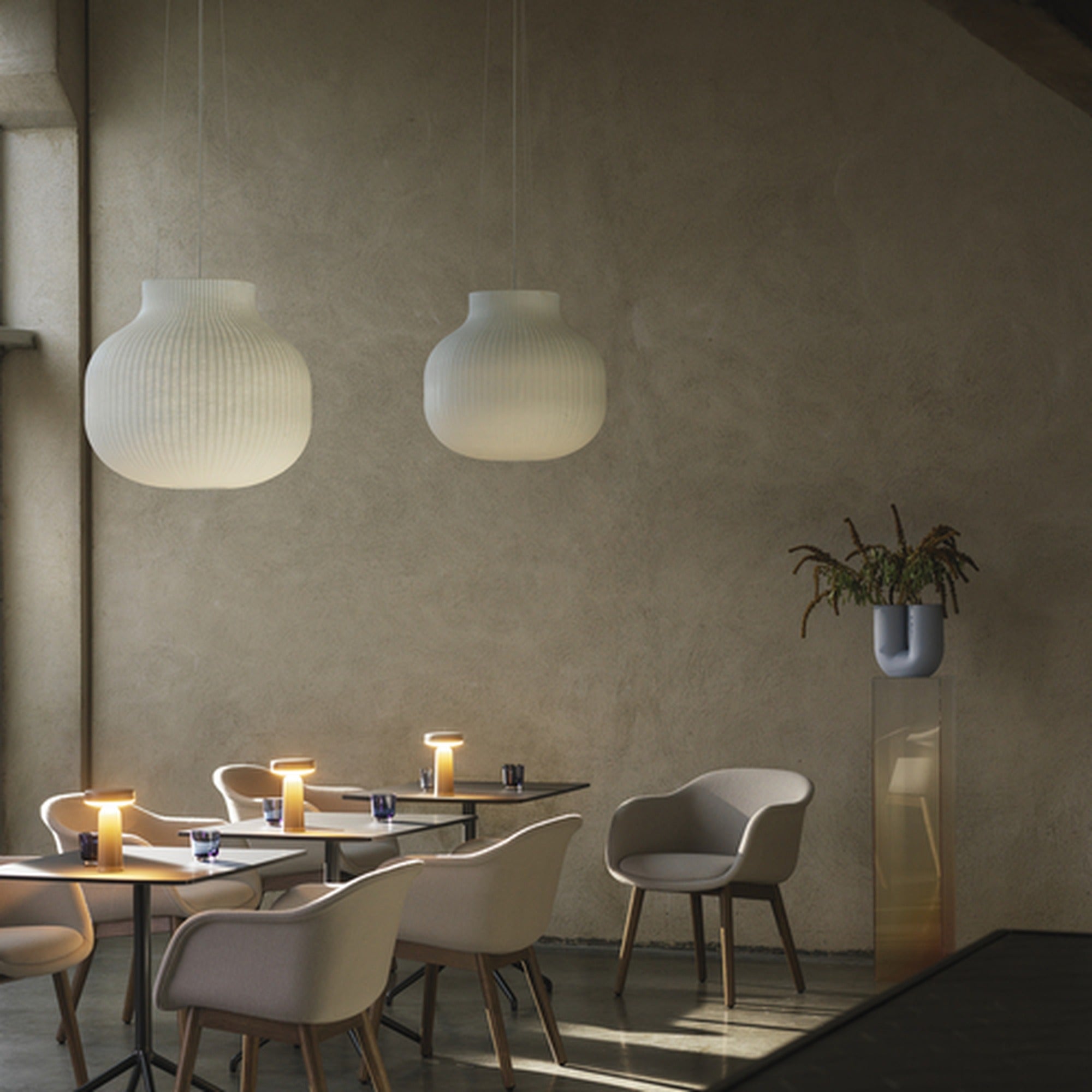 Inspired by shapes of traditional table lamps, the Ease Portable Lamp transforms this typology into a carriable size suitable to take wherever. Ease offers a high-quality dimmable, no-glare light with 3 levels, striking a balance between atmospheric and functional light. The design has a distinct lightness to it, with the top and bottom gently touching. A slightly flared bottom mimics the lip of a vase in a grounding gesture that allows the base to be slimmer and easier to grab. Ease Portable Lamp is a humble friend with a strong character that works alone or in repetition in any setting; from the bedside, reading nook and home office to the café table, co-working space or library.
