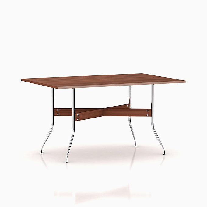The rectangular table has solid walnut stretcher with a walnut veneer top with a walnut edge. The chromed legs feature adjustable glides. George Nelson began with the legs, insisting that they be made of metal, machine formed, and prefinished. And beautiful. He wanted that graceful curve. He also wanted them to be easy for the consumer to assemble, so the desk and tables could be shipped knocked down to save on costs.