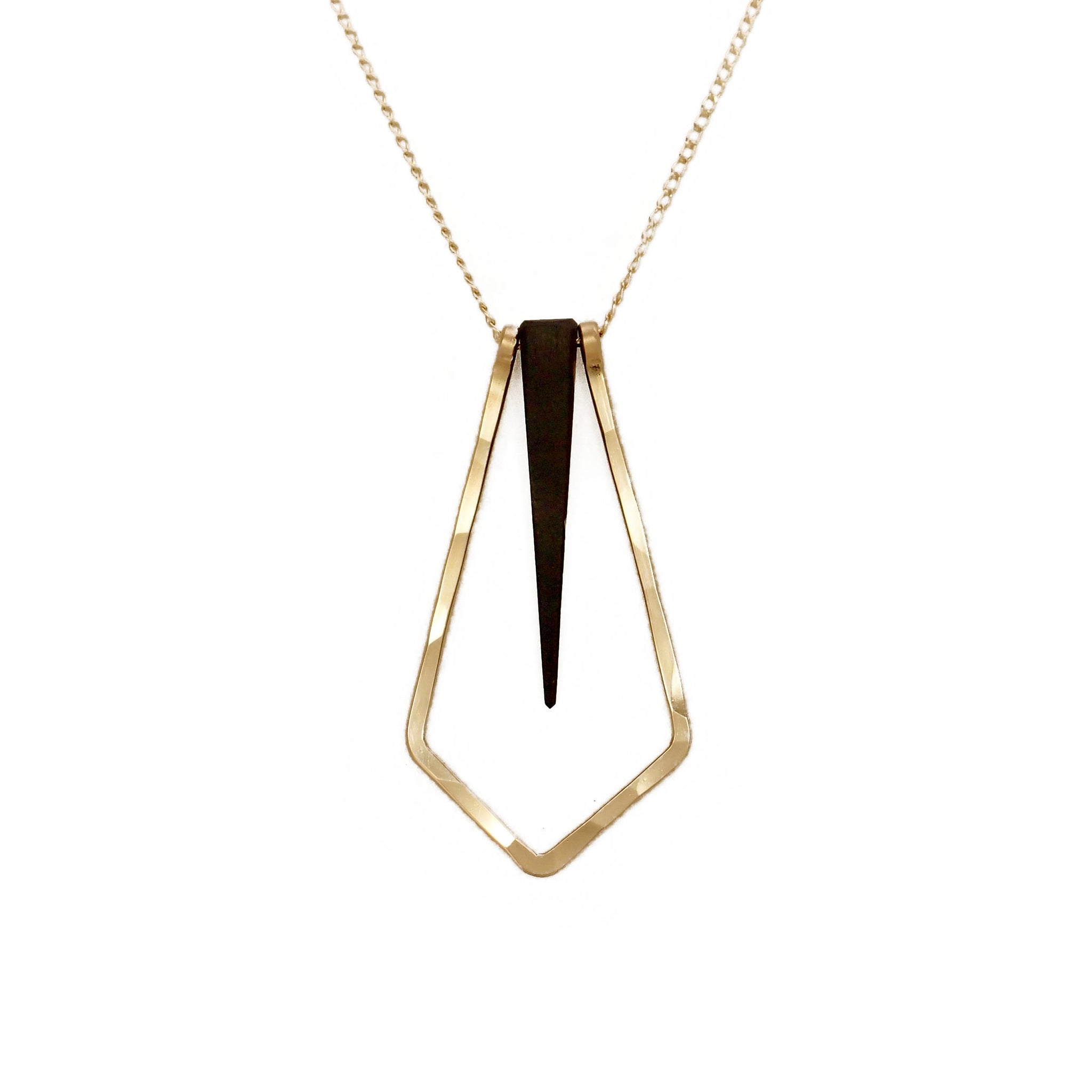 Hand-cut spike of ebony suspended within a diamond of sterling silver wire.