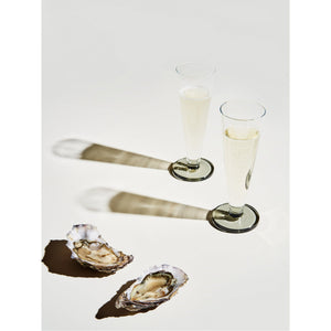 These Flute glasses by Tom Dixon are crafted from mouth-blown glass with a smoky hue. Featuring a thick, game puck-inspired base, the Puck collection blends minimalist design and durability. Its geometric shapes make it resilient, perfect for professional cocktail settings.