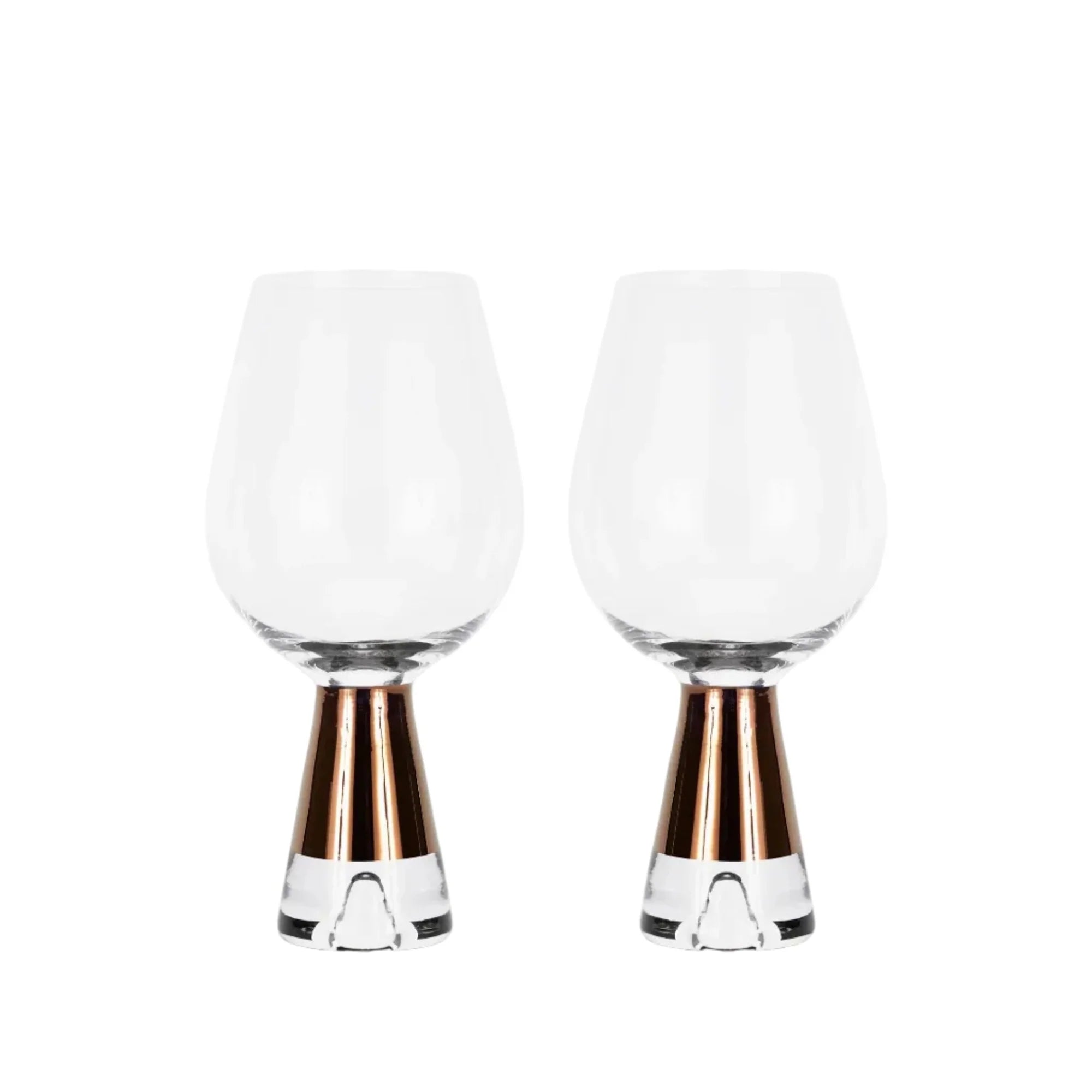 The Tank Wine Glasses Set by Tom Dixon take their inspiration from the functional shapes and volumes of scientific glassware. Made from mouth-blown glass and crafted in Poland, the hand-painted copper detailing gives a modern and distinctive finish. Featuring a cold-cut and polished edge, the Tank Wine Glasses Set has an etched Tom Dixon logo sand-blasted on the base.