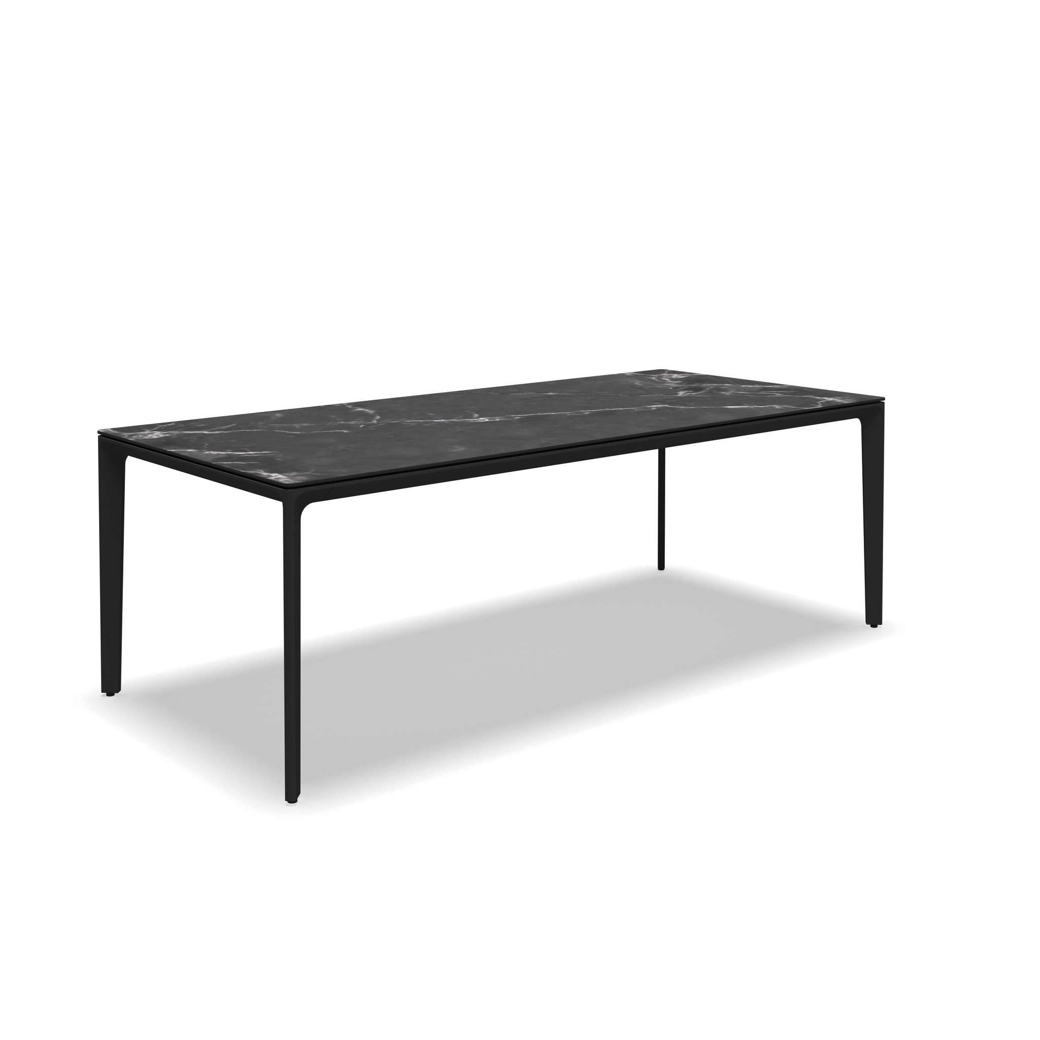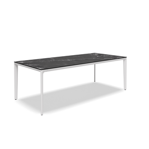 The Gloster Carver Dining Table is minimalist design at its best. The table measures 39.5 by 86.5 inches, comfortably seats eight people and features a powder-coated aluminum frame available in Meteor (dark) or White (light). The tabletop is available in either a natural teak or a Pumice color durable ceramic.