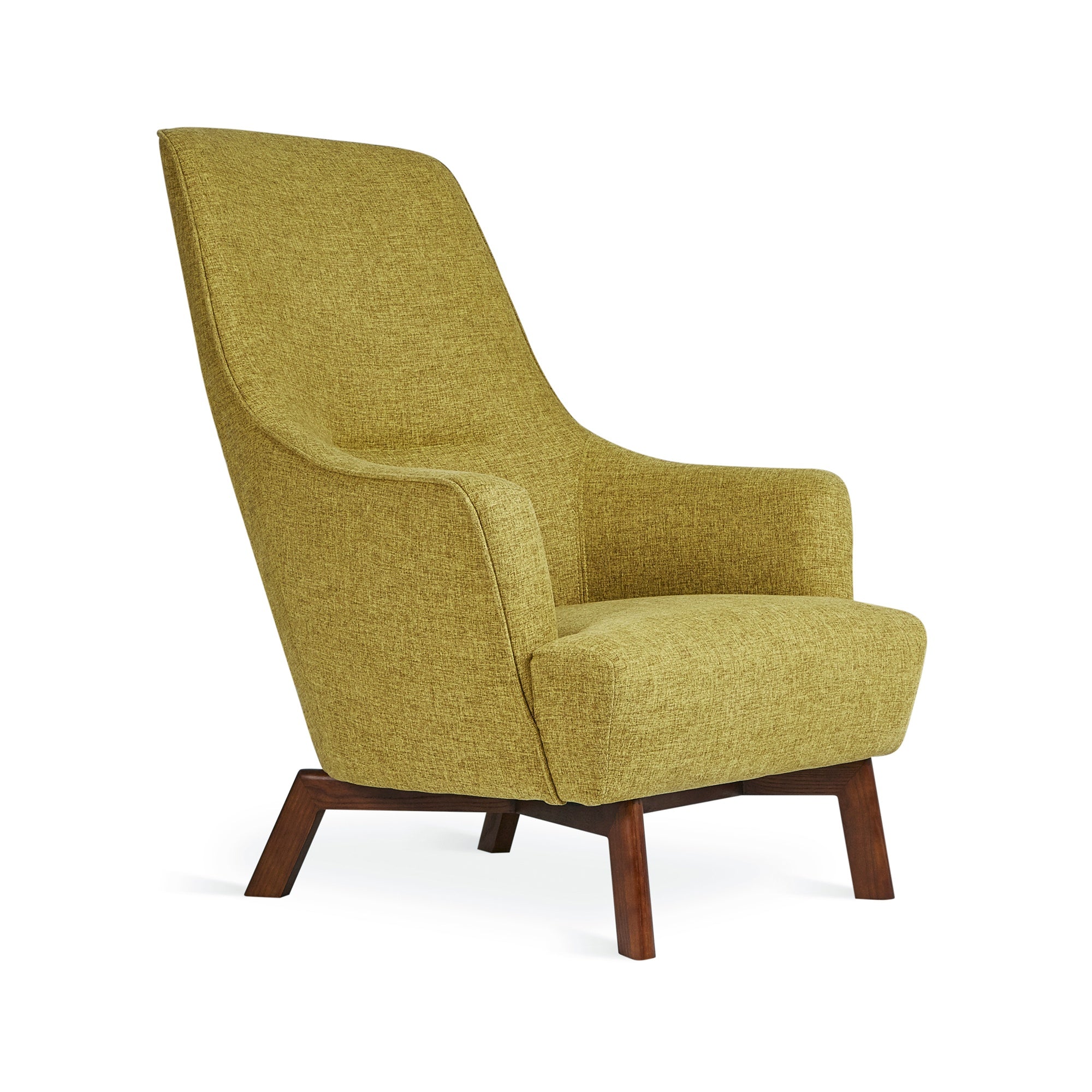 The Hilary Chair offers a contemporary interpretation of mid-century Scandinavian design, seamlessly blending fluid curves with tailored lines. A subtle channel-stitch detail on the backrest adds visual interest, while unbroken piping along the arms and back accentuates the chair's sculptural form. Its high back provides exceptional support, and the splayed angular wood base contributes to its architectural aesthetic, making it perfect for relaxing in style. Crafted with sustainability in mind, the Hilary Chair utilizes kiln-dried FSC®-Certified hardwood for its inner frame, supporting responsible forest management, and its select fabric is made from 100% recycled plastic bottles, diverting waste from landfills and waterways.