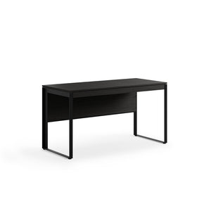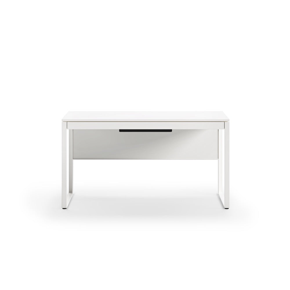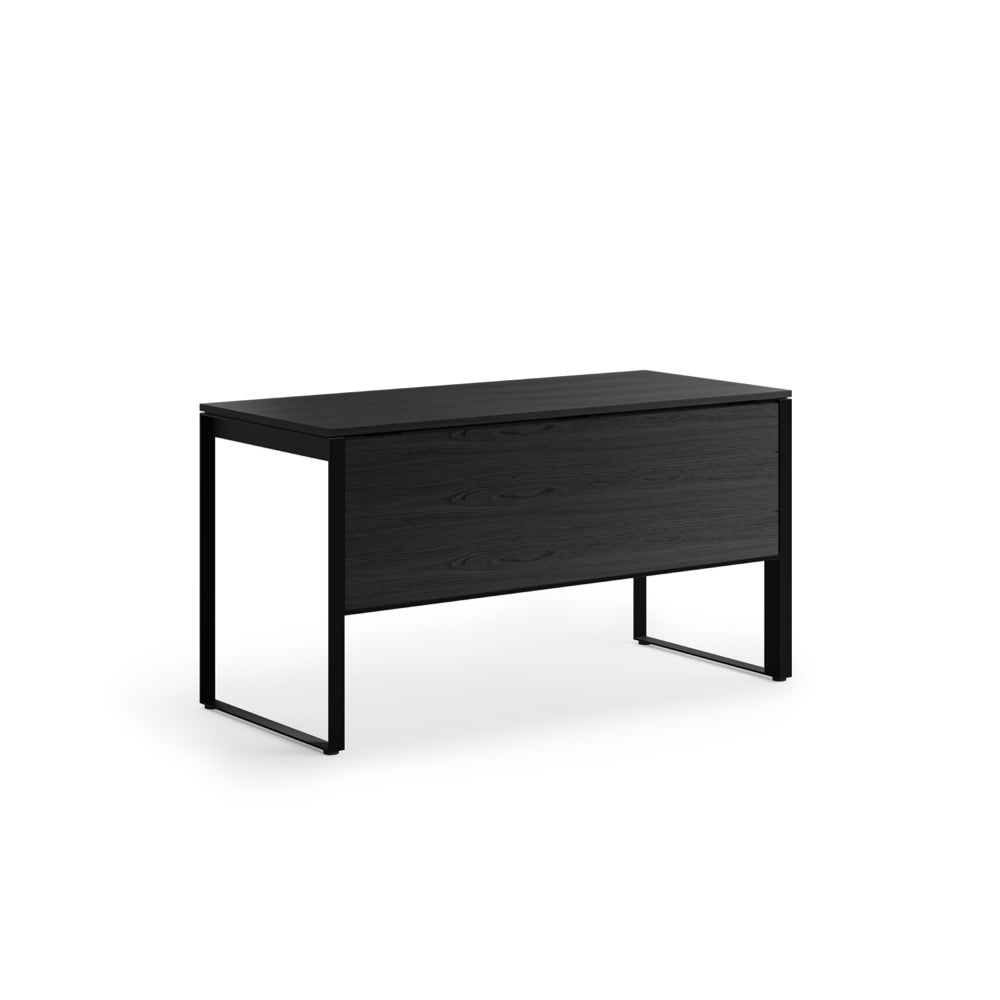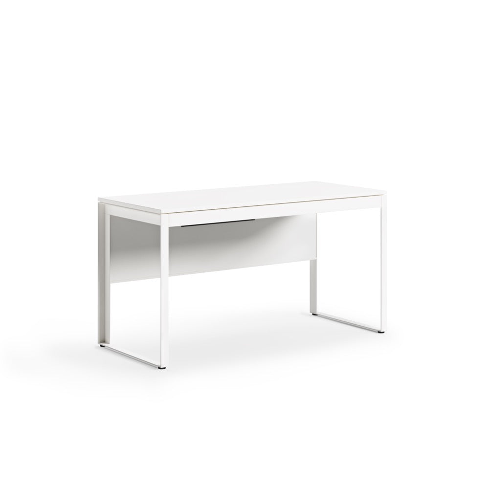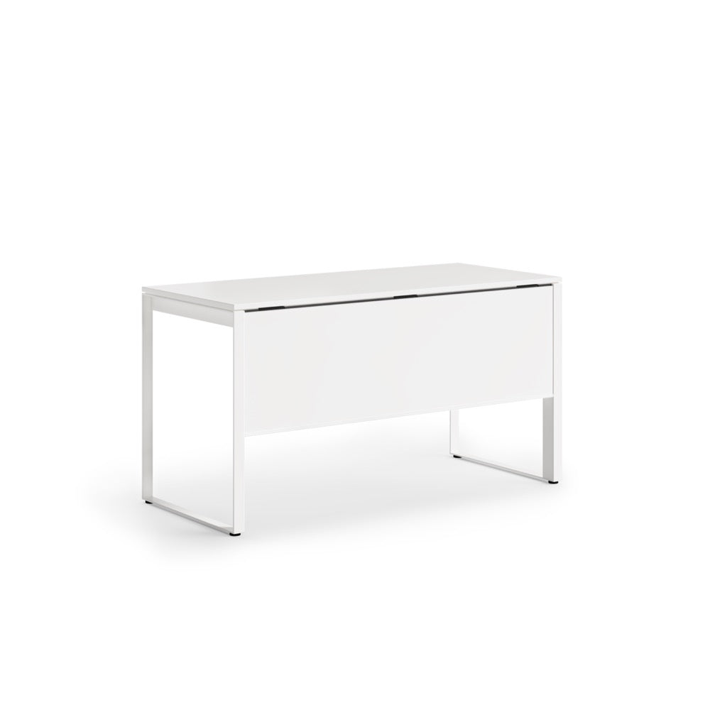 A modesty panel complements seated use, allows the desk to float in a room, and helps to keep wiring neatly concealed.