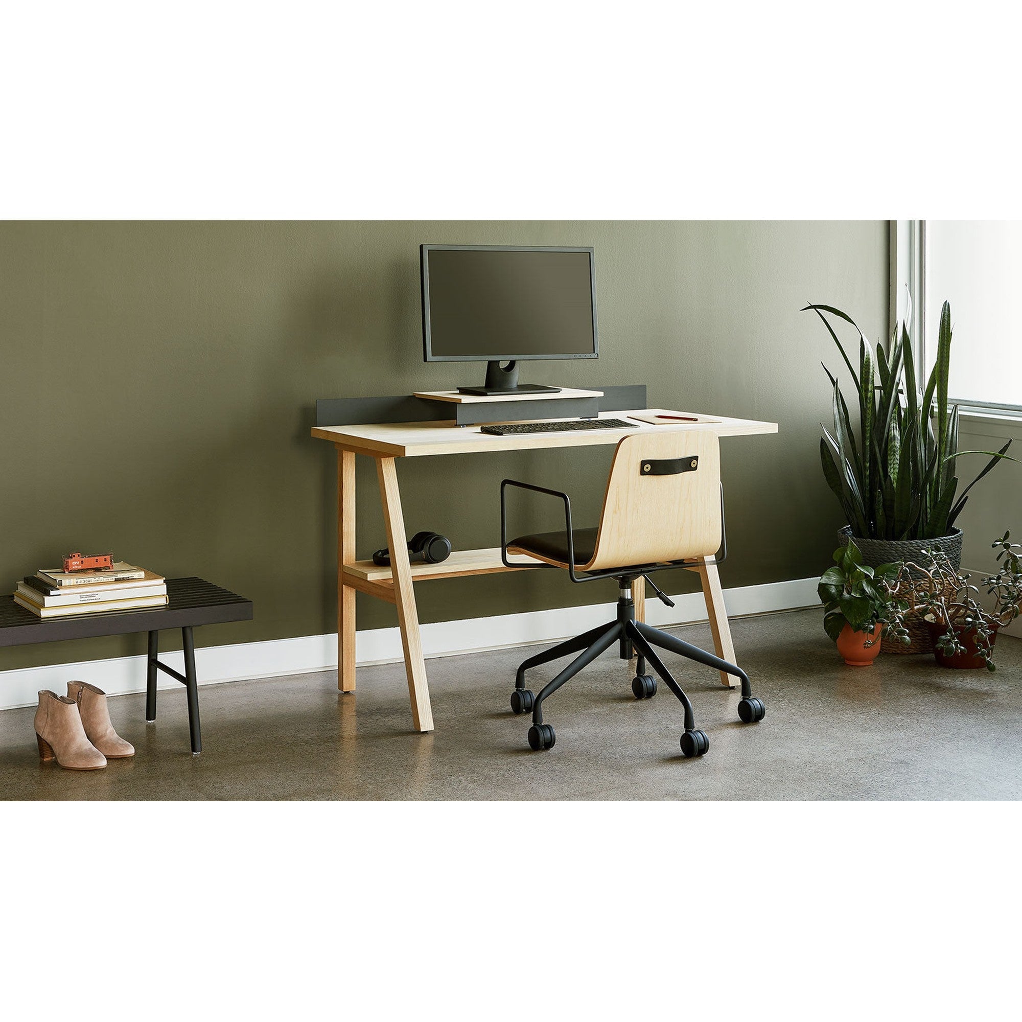 The ultimate space saver, the Truscott Desk by GUS* Modern offers a sleek way to add more workspace to your office without taking up extra room. The ergonomic raised platform is designed to hold your laptop or other electronics, allowing you to position your screens as needed for all-day comfort. Keeping things tidy with a cable management system and integrated bottom shelf, all distractions stay tucked away so you can focus on the tasks at hand. With a sleek solid ash frame, Truscott revamps any home office or workplace with its flair for modern convenience. Online exclusive. Not available in stores.
