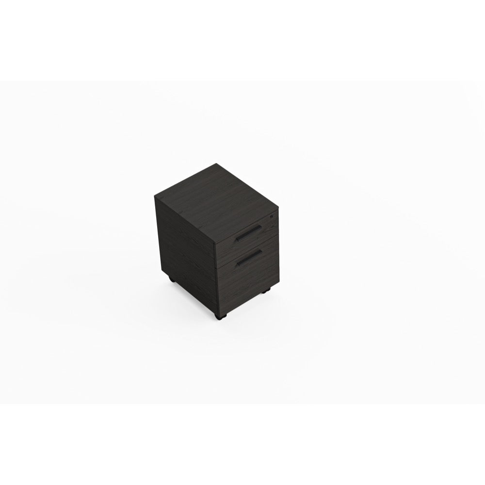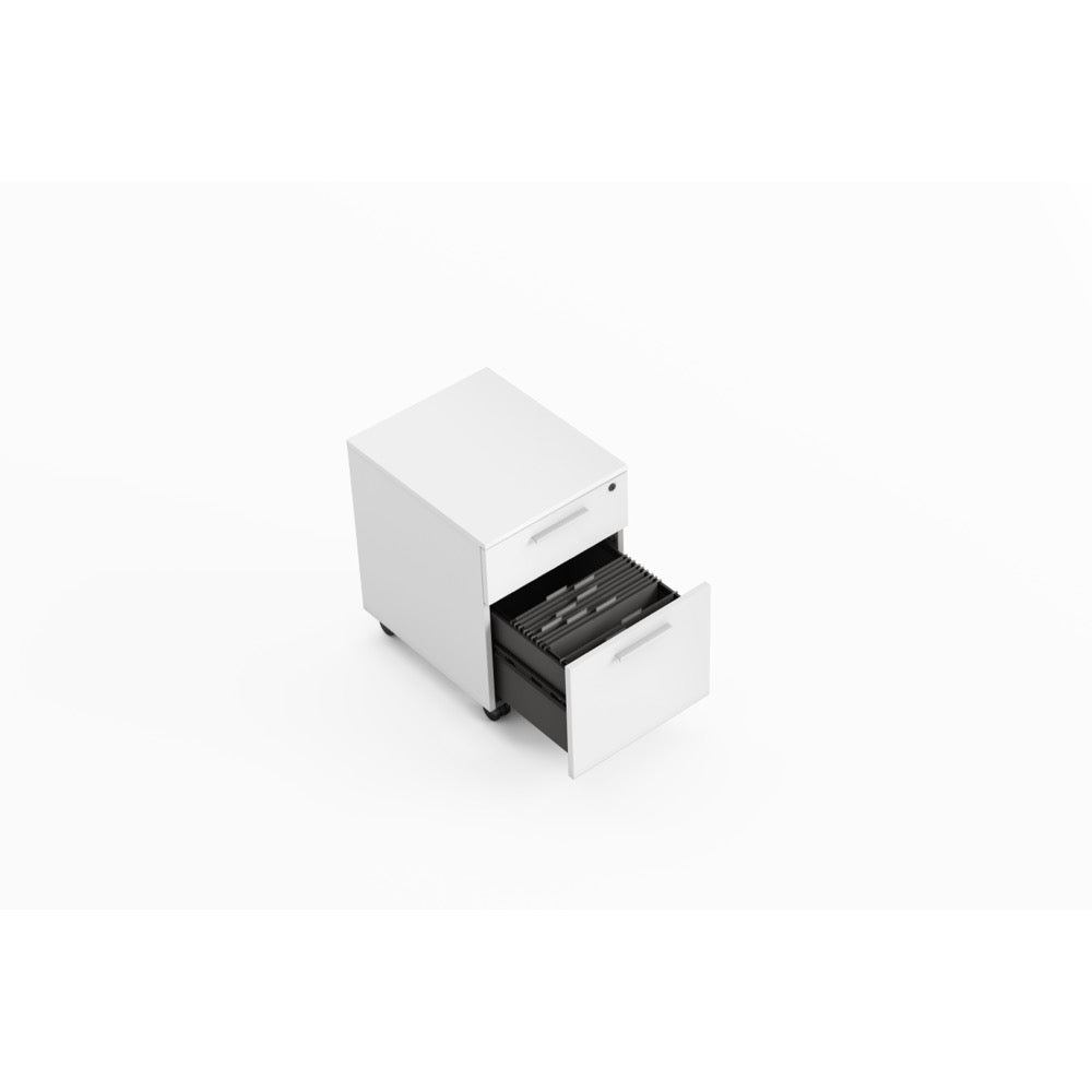 The Linea Mobile File Pedestal features locking wheels, a letter/legal-sized file drawer, and a top supply drawer. Perfect under a Linea desk or used as a mobile printer stand.