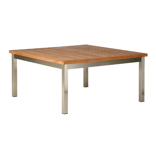 A modern outdoor table that combines sleek good looks and amazing durability. The equinox square conversation table is made from marine grade stainless steel and top-quality teak. It has an umbrella hole in the center. Pairs well with mercury deep seating.