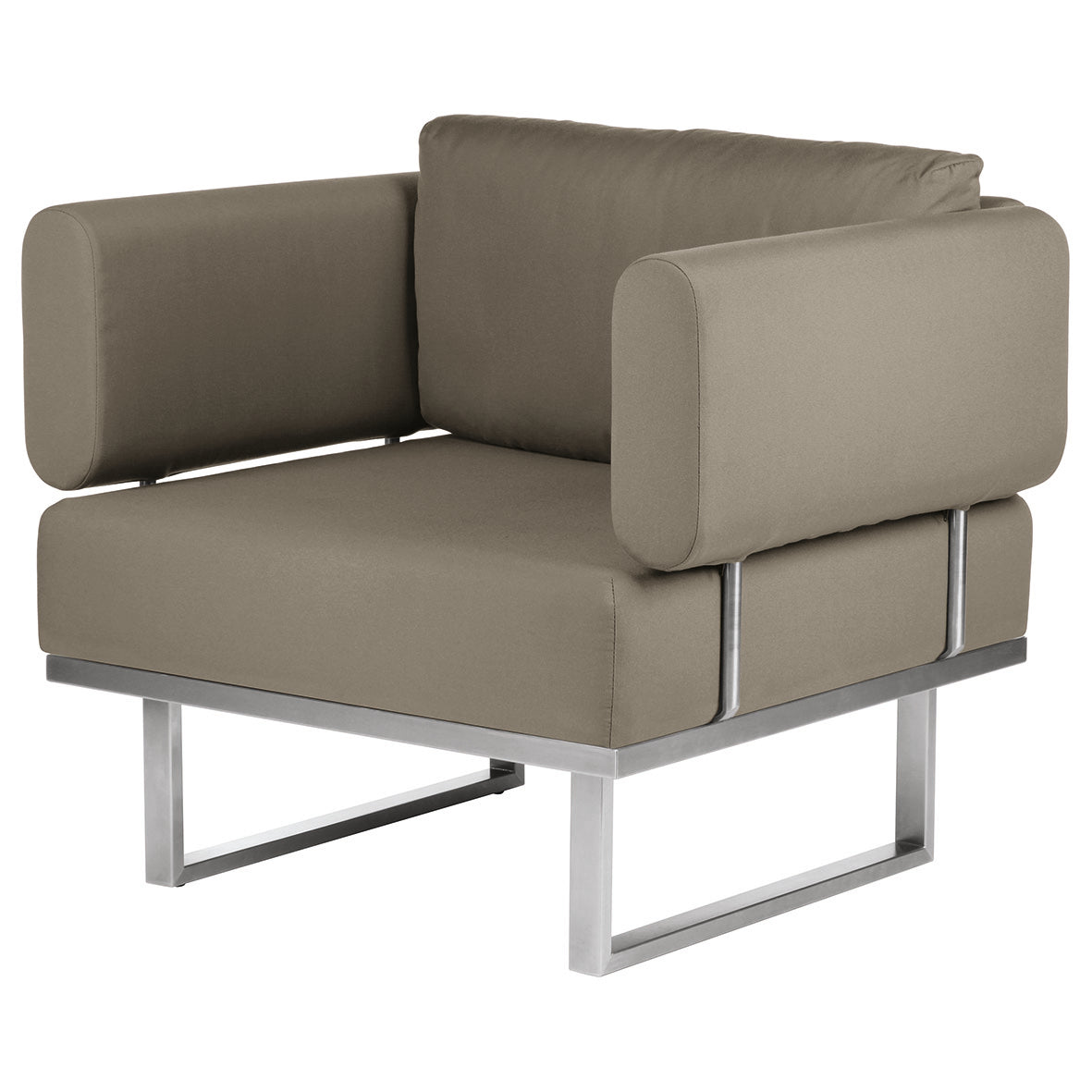 The mercury deep seating armchair has a sleek stainless steel frame and comes standard with the Sunbrella cushions, Sunbrella is a solution-dyed acrylic that resists fading or mildewing even when exposed to extremes of sunlight, temperature and moisture. The cushions come standard with EZ-DRI foam. EZ-DRI is a quick drying foam designed specifically for outdoor furniture. Loose back pillow included.