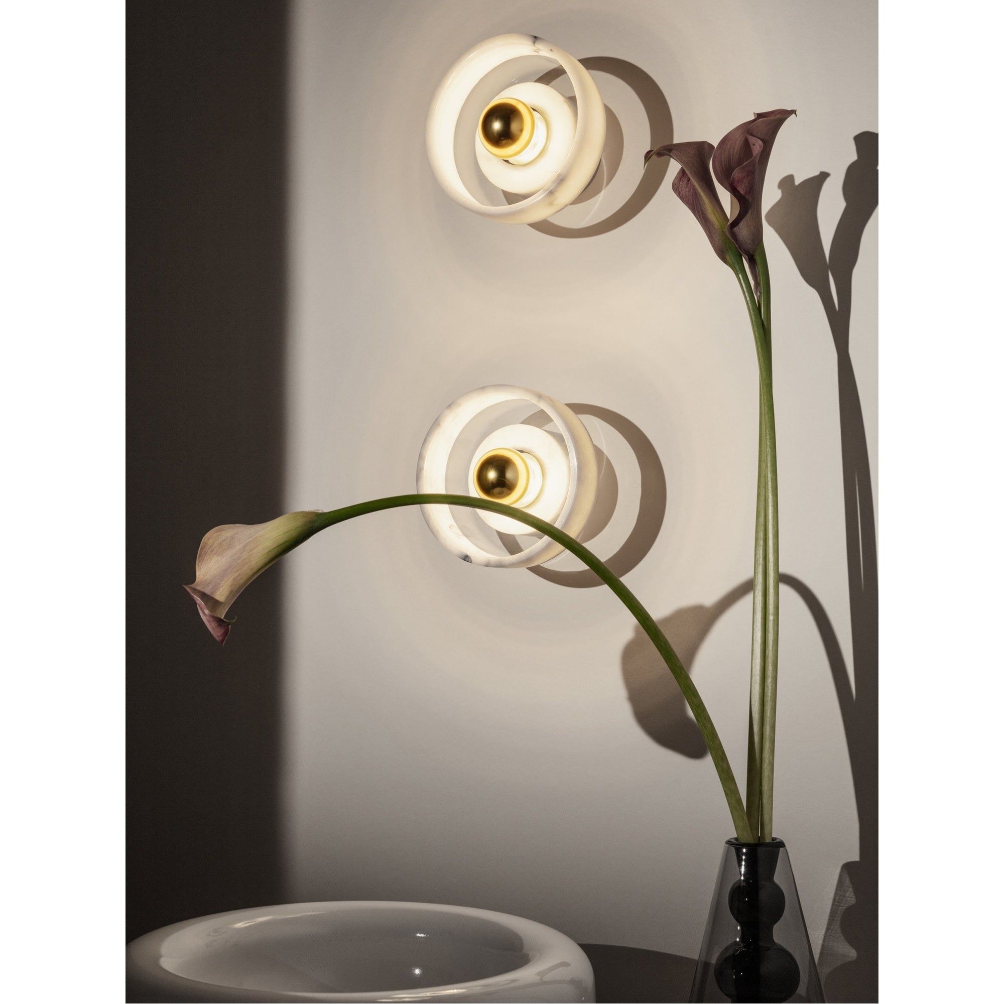 The stone wall light by Tom Dixon is crafted from heavy white marble, offering a tough yet tactile feel. With a unique circular shape, it combines minimalism with functionality. The LED light casts a playful round shadow when switched on, adding a distinctive mood to any space.
