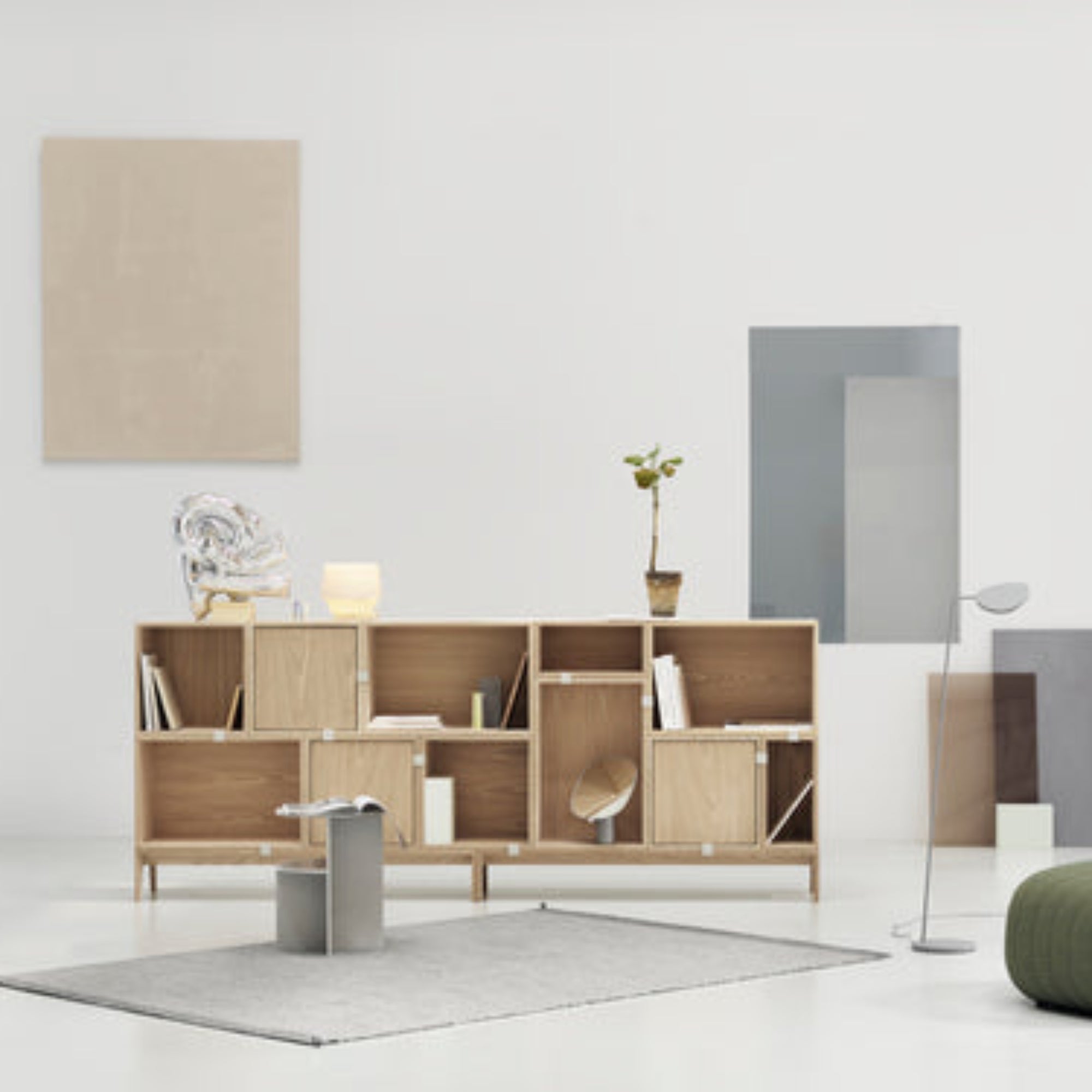 Being both versatile and functional, the Stacked Storage System can be arranged and rearranged for the exact aesthetic and functional needs of any space. Seen here is a selection of predesigned bookshelf configurations that bring modern storage to any home, workplace or hospitality setting. All modules with backboard can be mounted directly onto the wall.