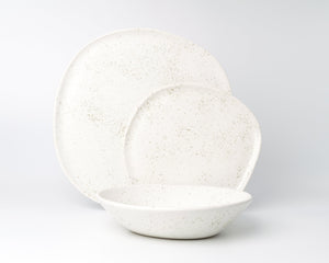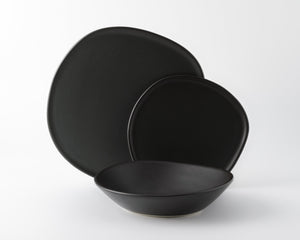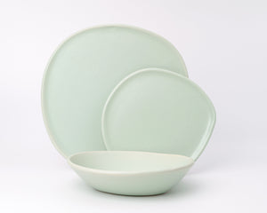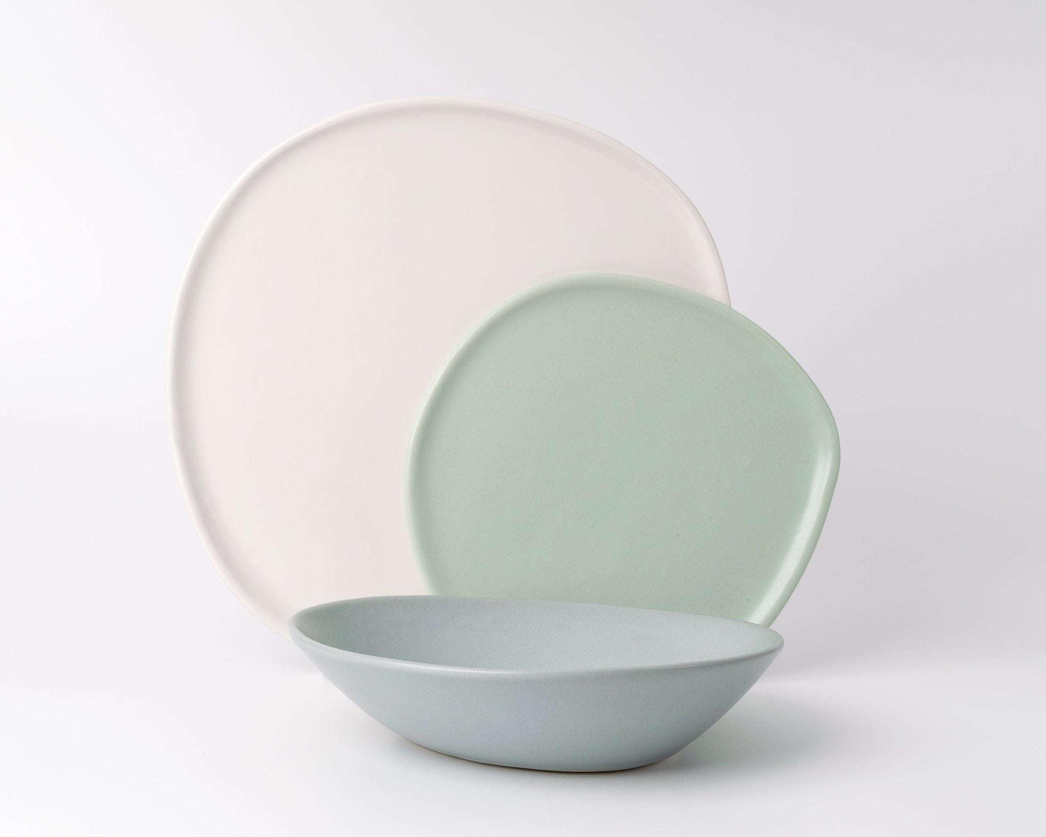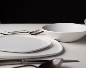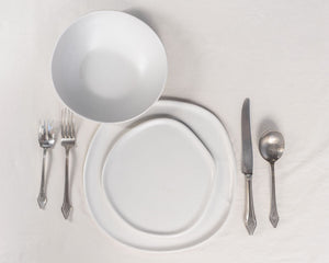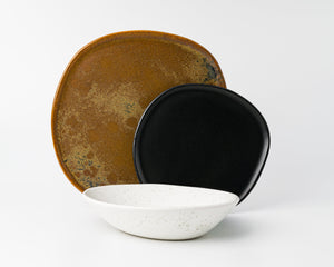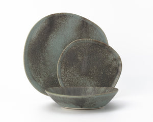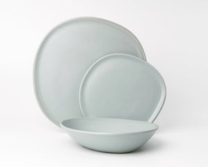 The 3-piece Ripple Dinner Setting is a simple, minimal place setting of our Ripple line. Featuring the central Ripple Dinner Plate with organic lines that evoke a flat river rock, the versatile 8" Ripple Salad Plate perfect for salads or light mains, and the low-slung Ripple Pasta Bowl that looks like a hollowed-out river stone. One of our most popular settings, it's a versatile, beautiful place to start as you build out your Haand collection with painterly, fluid pieces.