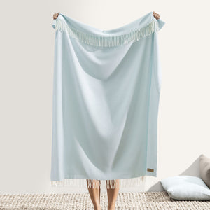 Baby Blue herringbone throw is cashmere-soft and sophisticated with fresh white decorative fringe. Known for its light weight versatility, this four-season accent throw makes it the perfect addition to bedrooms and living spaces.