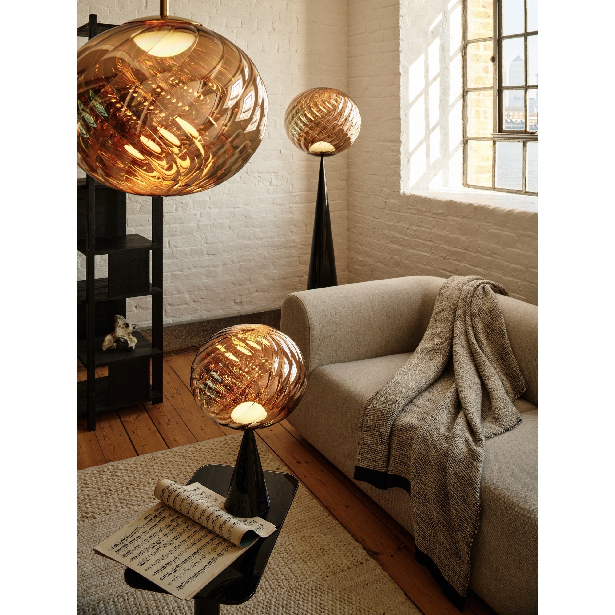 The WHIRL Cone Fat Floor Light in gold by Tom Dixon is a striking floor light inspired by the op-art movement and designed to create abstract patterns through its spiral form. Crafted from lightweight yet durable polycarbonate, the shade is produced using advanced injection blow molding and vacuum metallization. It is compatible with Edison Screw (ES) or LED pendant fittings, making it versatile across different settings and an eye-catching addition to any space.