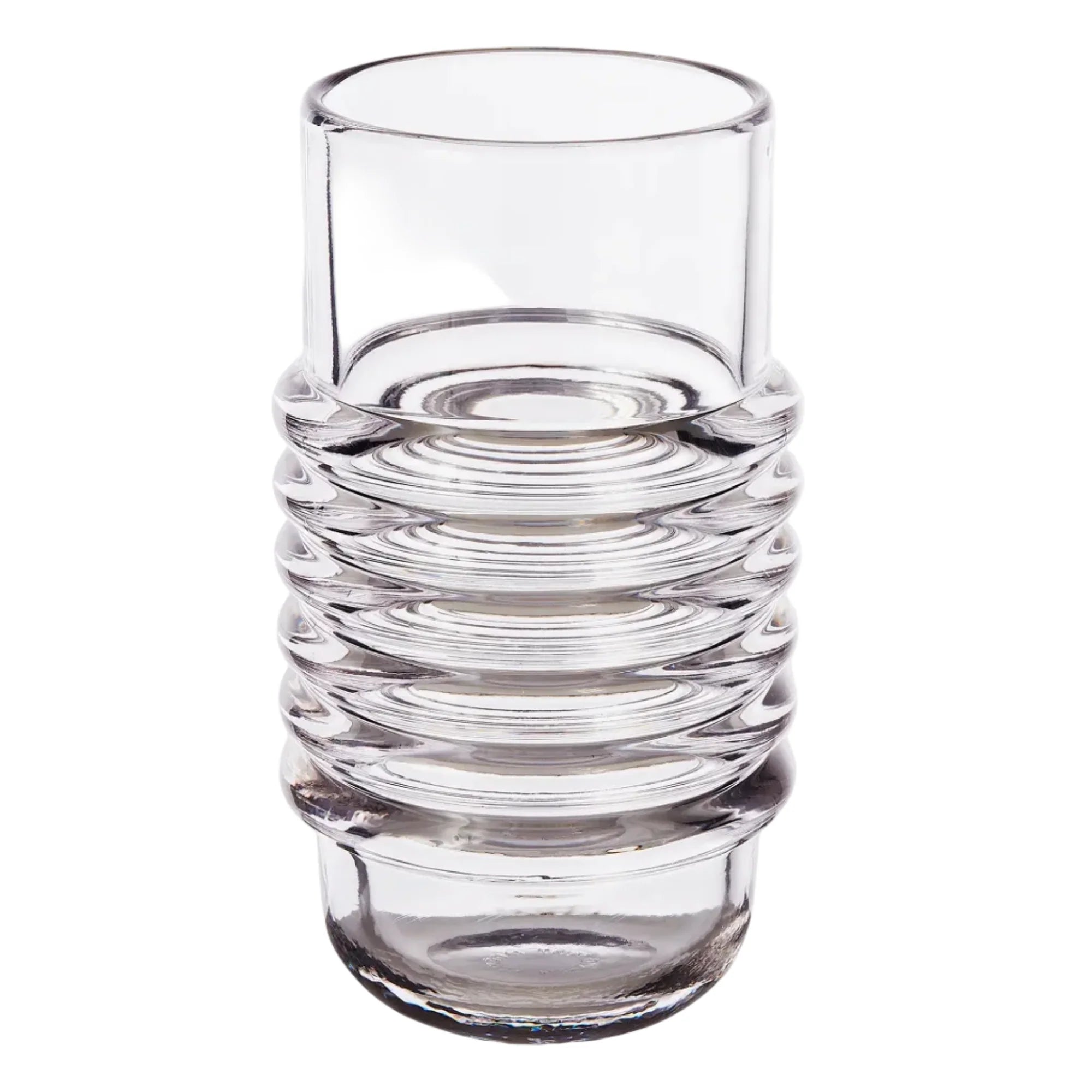 Press vases by Tom Dixon are designed to catch and refract light, casting eye-catching shadows. The heavyweight grooved vase is made of chunky coils of pure glass. Bold in silhouette and simple in function, it is manufactured by dropping big globs of molten glass and pressed in iron moulds.