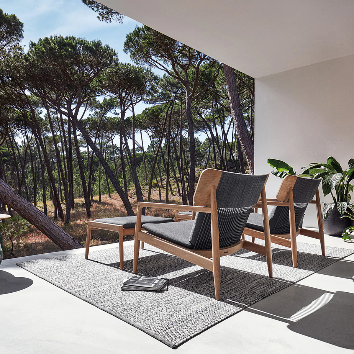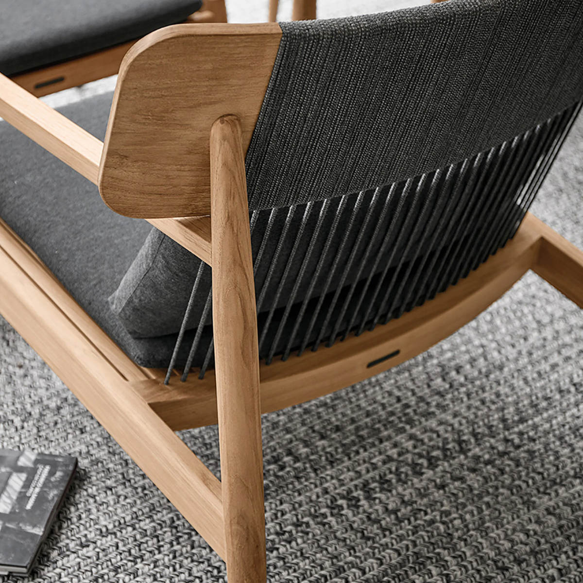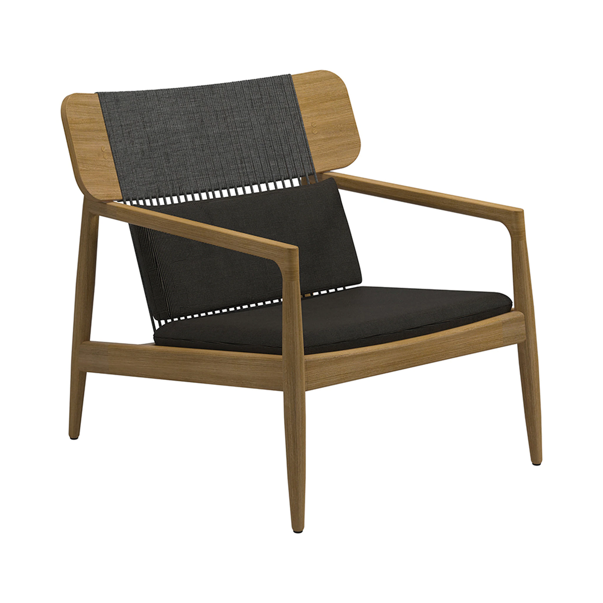 With its clean lines in natural teak wood, the Gloster Archi Lounge Chair evokes a mid-century modern appeal. Add this piece to your outdoor space to rest and recharge in style. Thin ropes connect the top of the teak chair to the bolster cushion and down to the padded seat. Archi proves that thoughtfully simple construction and design is not only beautiful, but supremely comfortable too.
