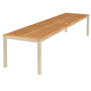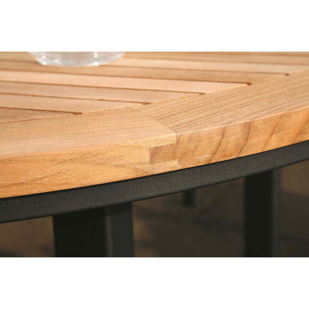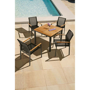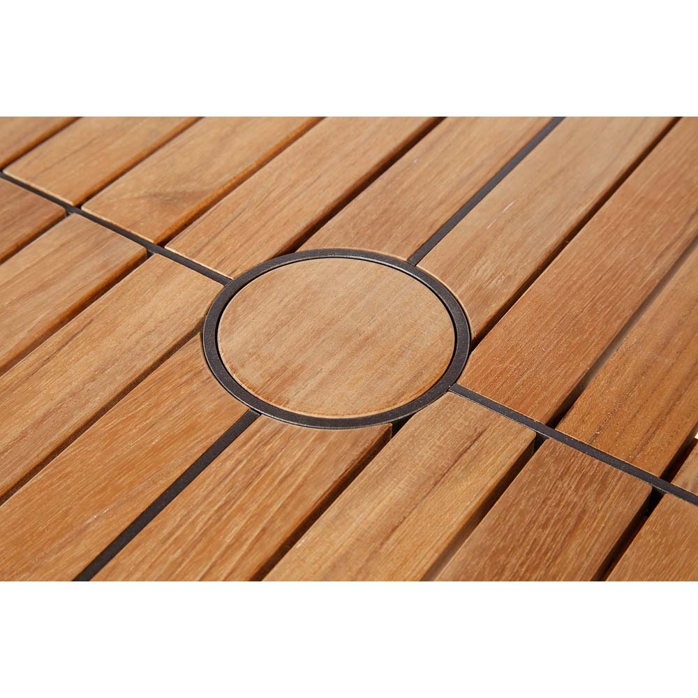 Powder coated aluminum and teak gives this table a more contemporary look. The table top has a thread of aluminum running across it and around the parasol hole. A teak plug is also supplied for when a parasol is not used.