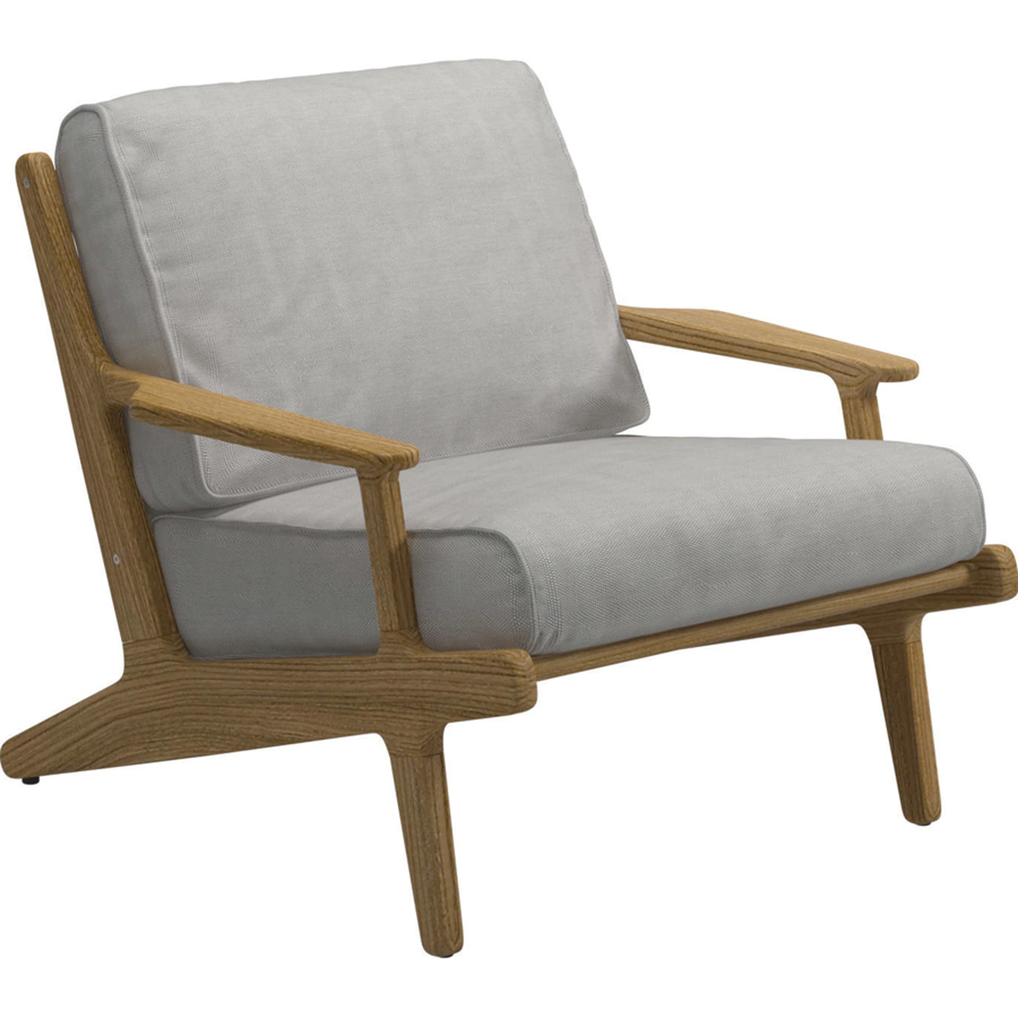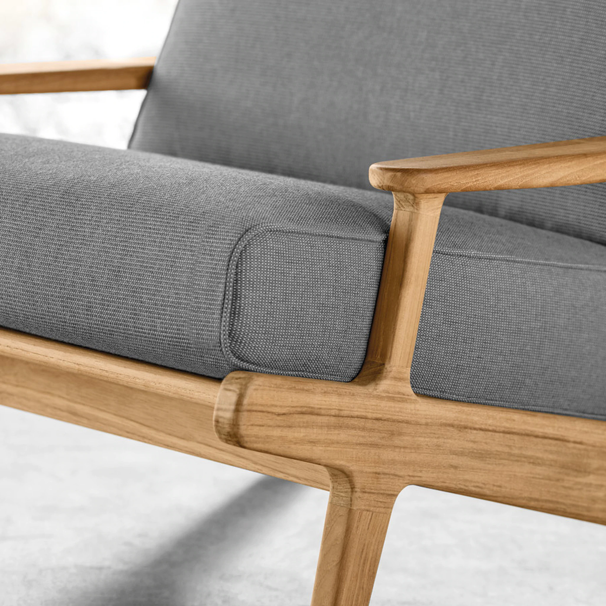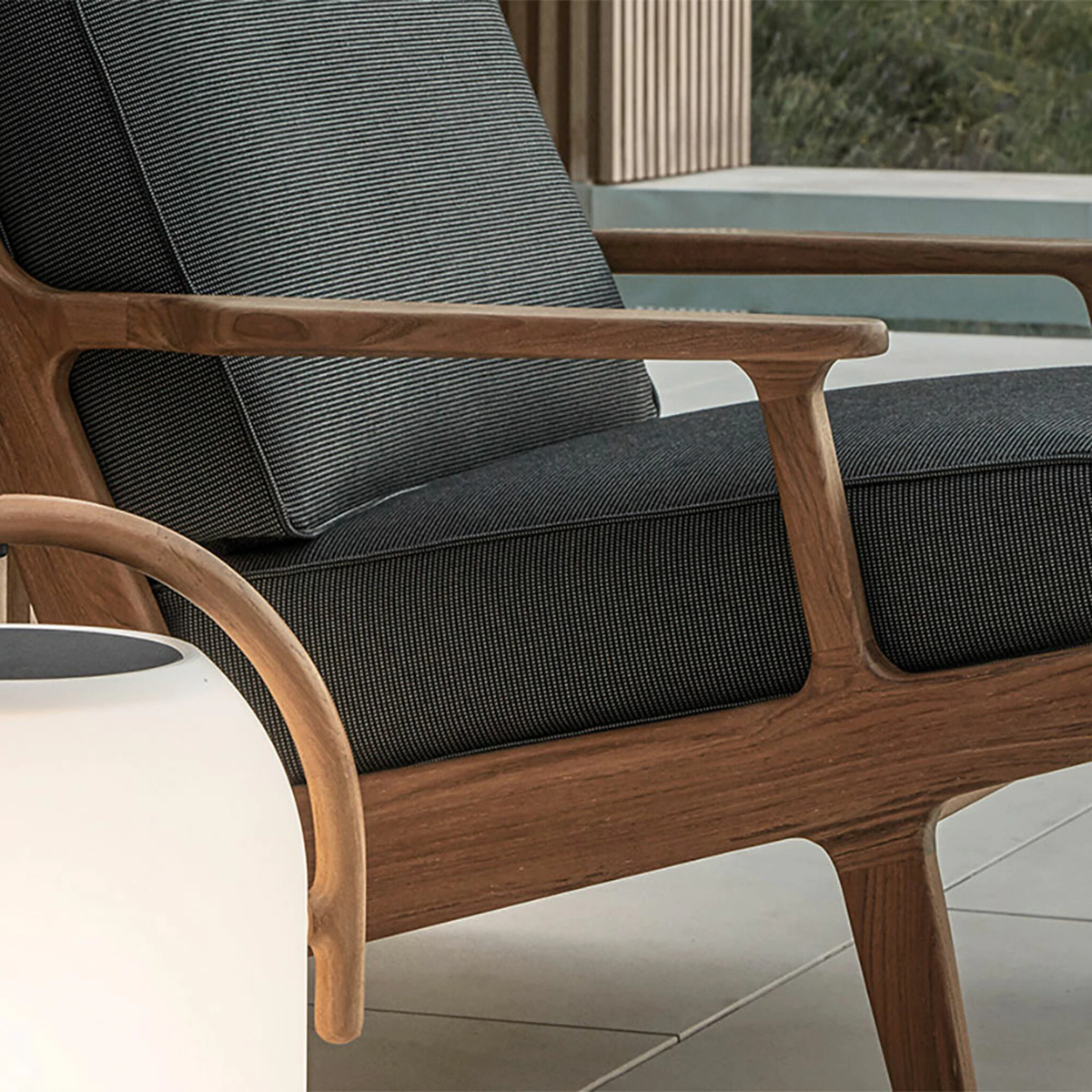 Exemplary design and craftsmanship are hallmarks of the award wining Gloster Bay line and this shines through in the Lounge Chair. The solid teak frame is beautifully crafted to enhance the natural beauty of the wood. Teak weathers to a silver grey patina and is naturally moisture and pest resistant. Create a look that is all your own with this instant classic by choosing from countless all-weather fabrics for the plush seat and back cushions.