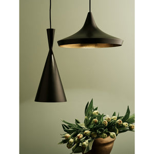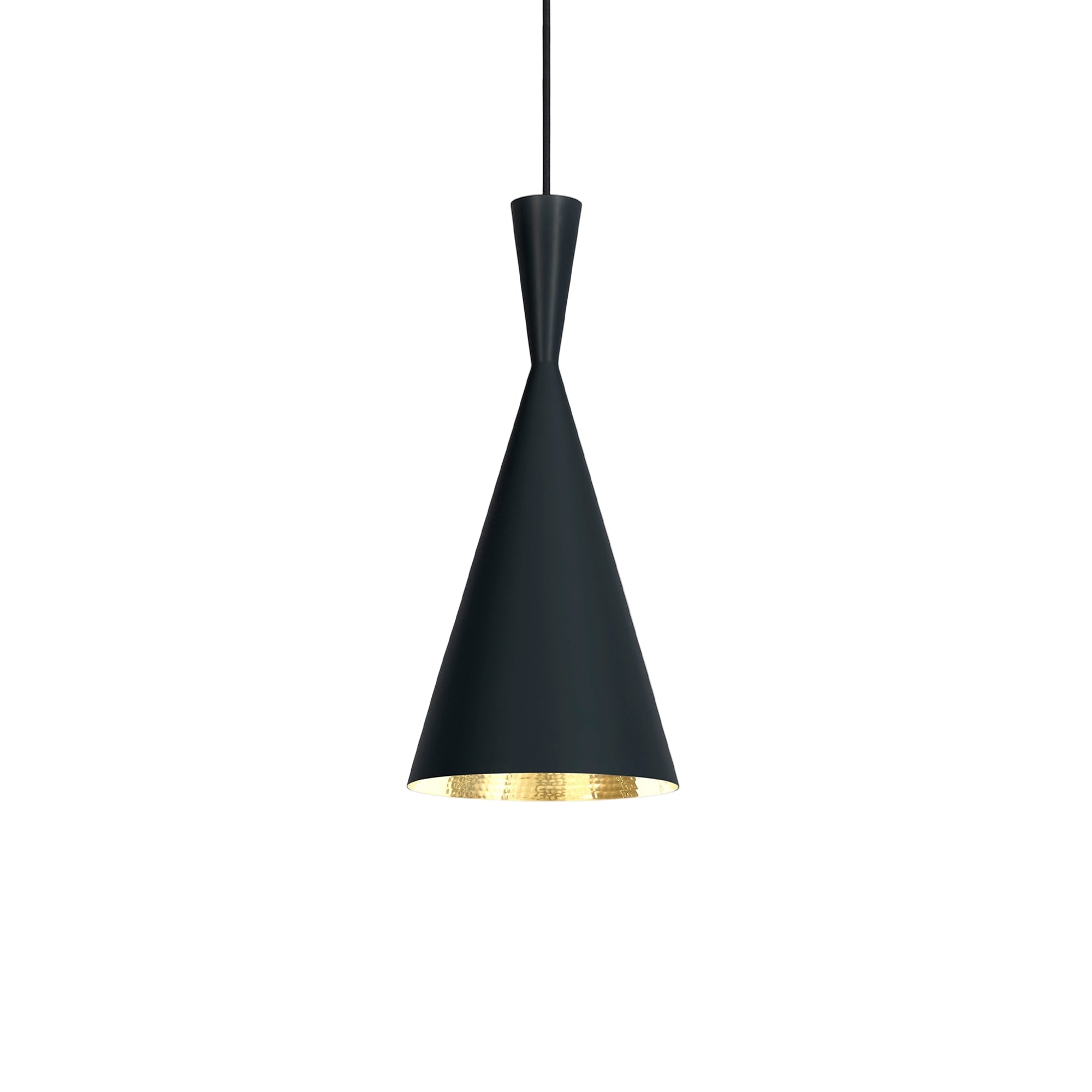BEAT Tall by Tom Dixon is a handcrafted brass pendant light with a warm, golden interior, made by artisans in Northern India. Its beaten surface reflects soft light, showcasing the beauty of handmade craftsmanship. The BEAT collection includes various light types, featuring an energy-efficient, dimmable, and serviceable LED module.