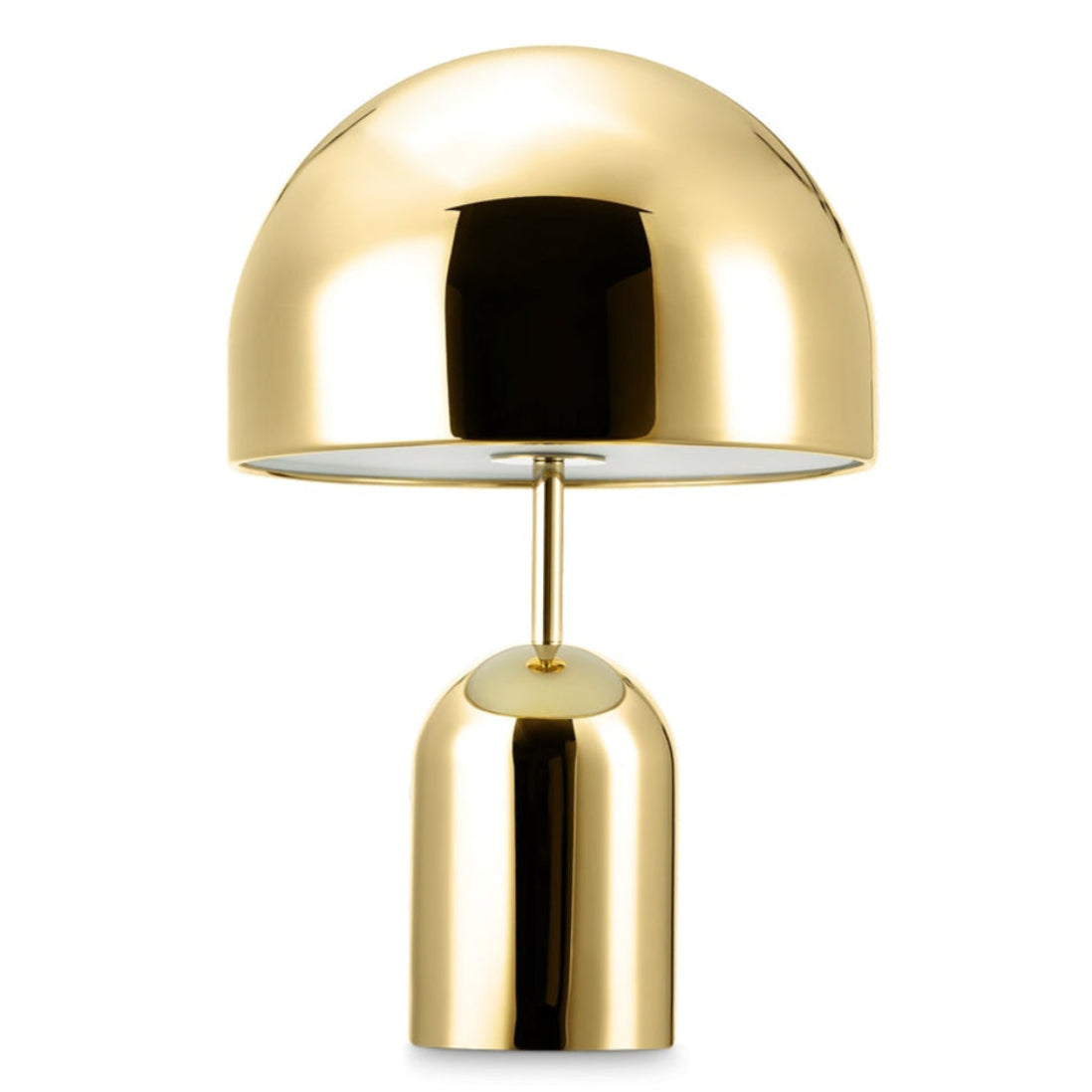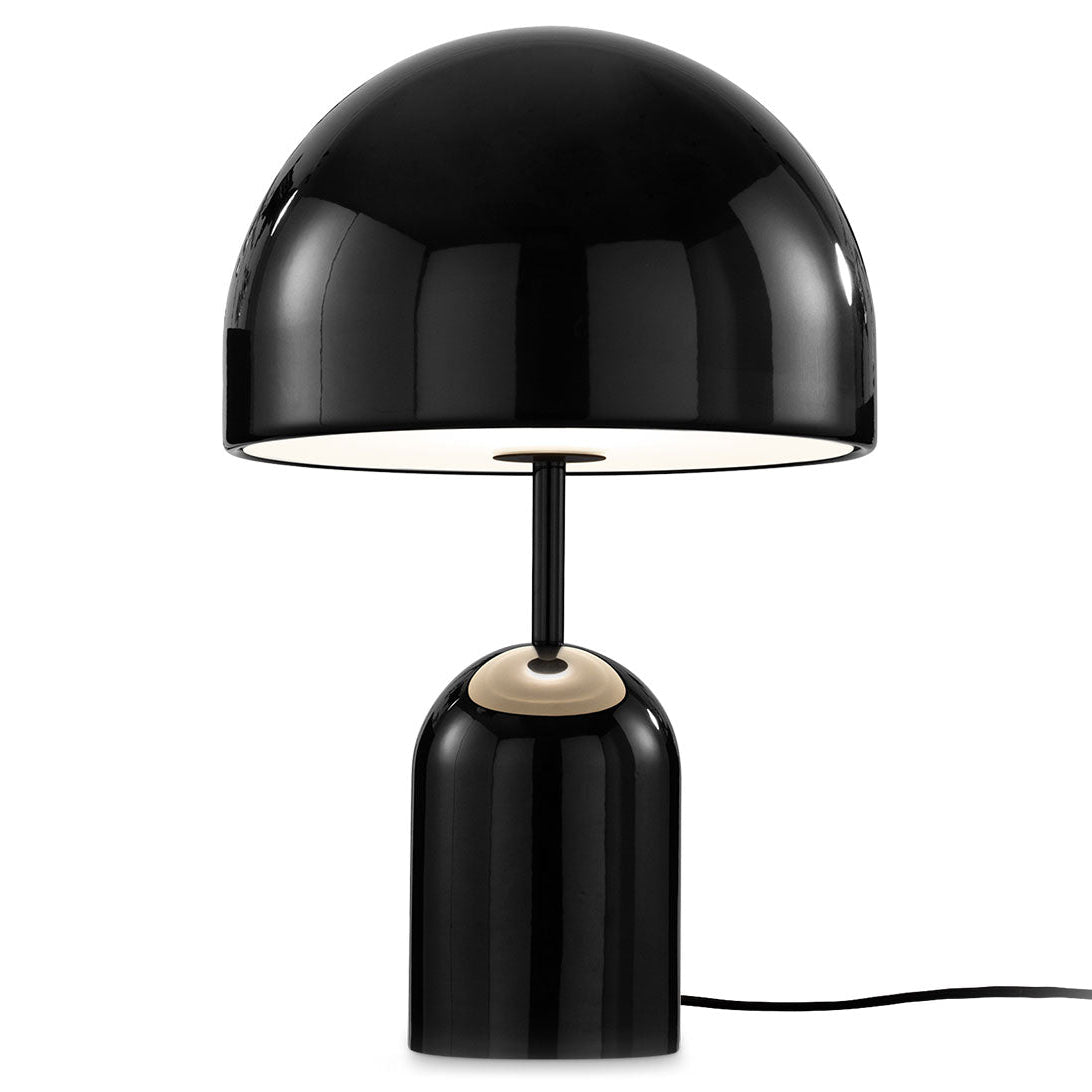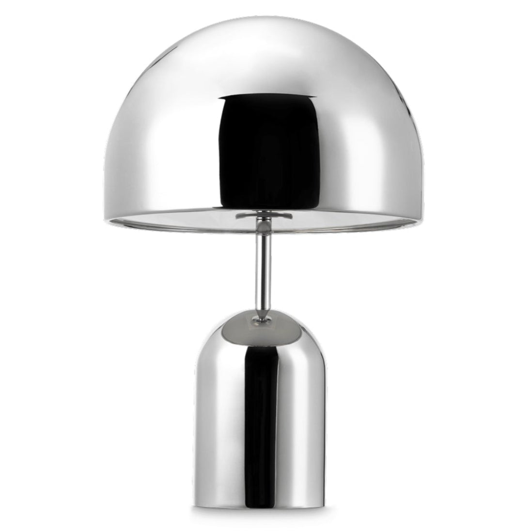 The Bell table lamp by Tom Dixon is a minimalist, high-gloss table lamp inspired by vintage car bumpers. Crafted from plated pressed steel, it mirrors its surroundings while a concealed diffuser emits soft light. This table light is available in a range of colorways and includes an energy-efficient 3000k LED soft light fitting.