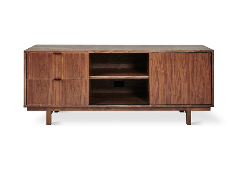 The Belmont Media Stand is an architecturally inspired storage design that features the natural beauty of walnut. Designed for Hi-Fi and media components, a back panel opening in the cabinet allows for concealed cable management. Drawers provide storage to keep your living room uncluttered, while adjustable shelves and a sliding front panel let you reveal or conceal components. Part of the Belmont Storage Series, this media stand matches perfectly with the Belmont Credenza and End Table.