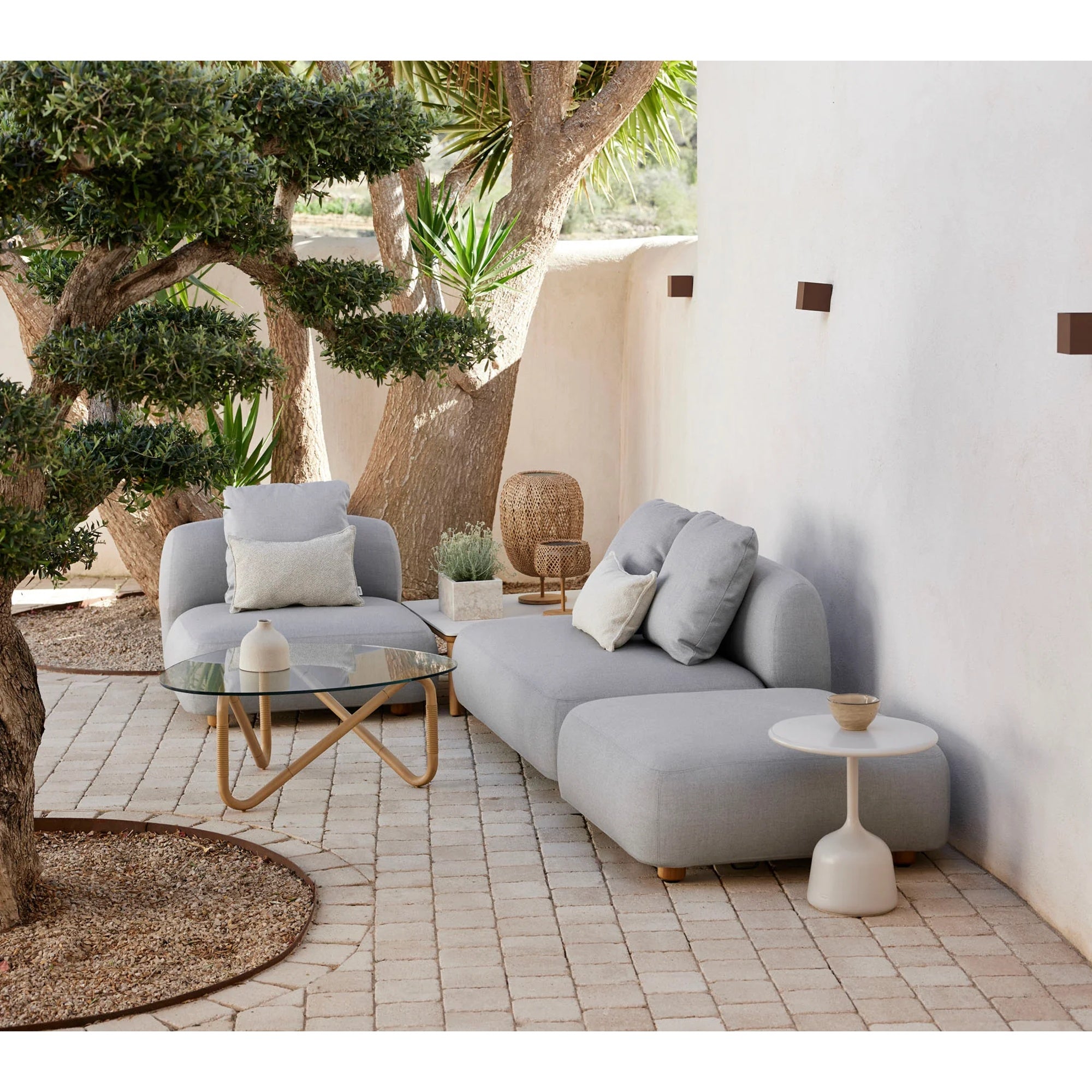 This modular lounge concept allows you to configure individual elements in multiple ways to perfectly match your taste and optimize your space. Designed by Cane-line Design, this laidback lounge piece features a firm and fully upholstered seat, back, and armrest, creating an inviting and comfortable outdoor retreat. Its curvy and voluminous design details provide an embracing expression to your outdoor space.