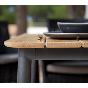 The frame is constructed from sturdy aluminum, providing a stable and durable base. The tabletop features Grade A teakwood slats, known for its exceptional quality and rich character.