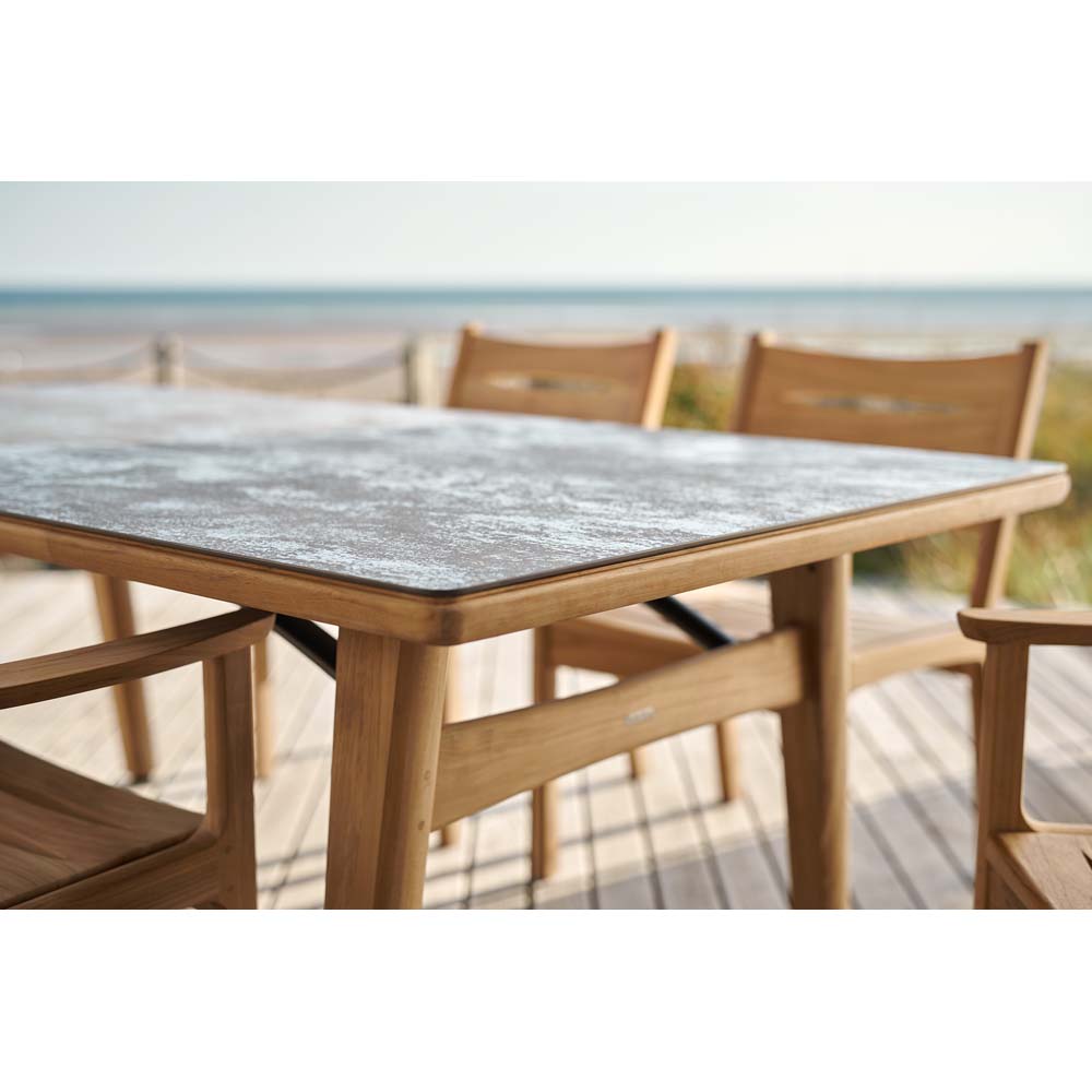 This elegant armchair is made from quality materials using refined construction methods that combine a sculpted solid teak frame with a seat and back to match.