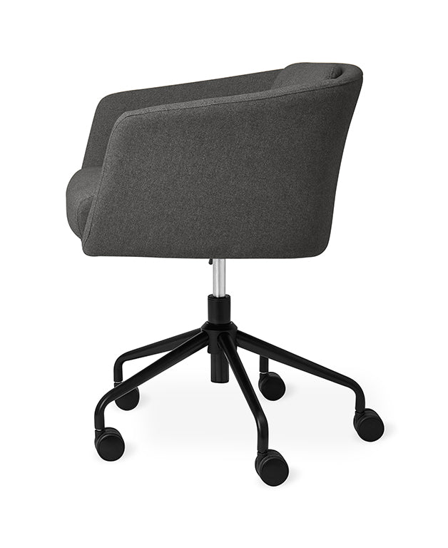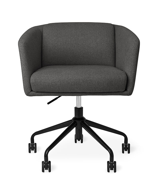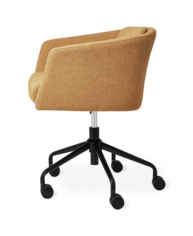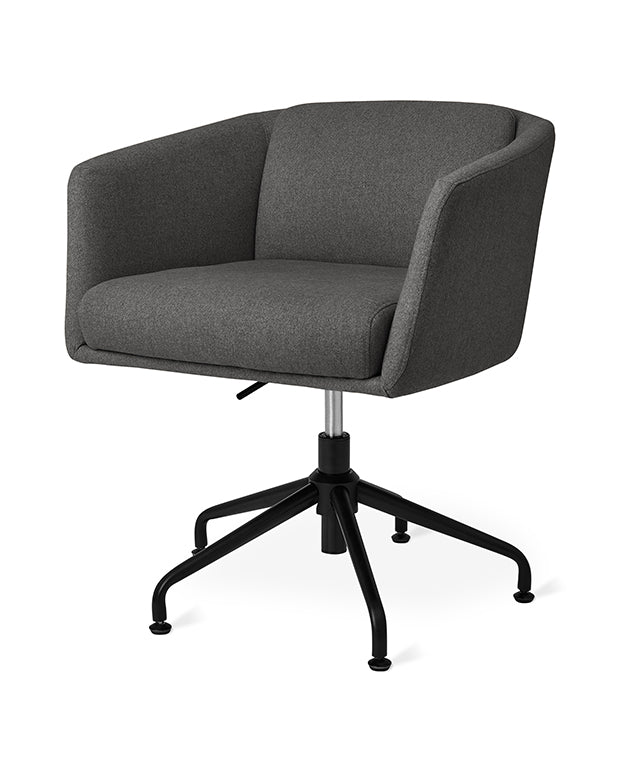 With an elegantly upholstered tub-style form, the Radius Task Chair is office furniture that captivates with its casual sophistication. Centering a stylish aesthetic and welcoming feel, Radius makes no sacrifices in function: adjustable height, swivel ability, and an option to configure with rolling castors or stationary feet make it the perfect addition to the modern workspace.