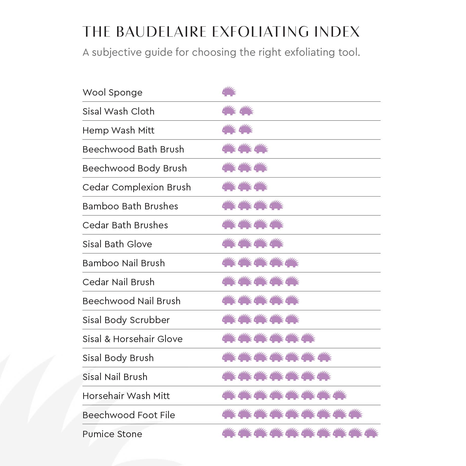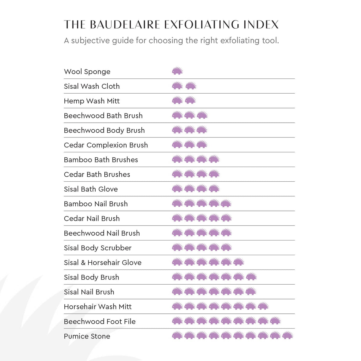 WHY EXFOLIATE? • Stimulates healthy circulation • Removes top layer of dead skin cells • Opens pores to air, moisture, and nourishment • Leaves skin with a bright and healthy glow Craftsmanship and sustainability are two of Baudelaire's guiding principles. To support this, we are proud to have our bath gloves produced by a women's collective in Colombia.