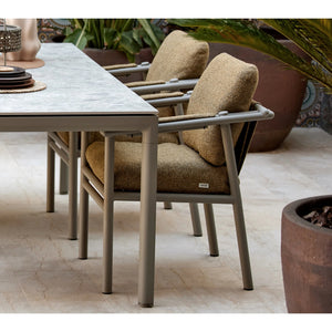 The frame is crafted from durable aluminium or teak, providing a solid foundation for years of enjoyment. The cushions are made with weather-resistant fabric designed for outdoor use. For routine cleaning, wipe the frame with a damp cloth. The cushion covers can be removed and washed according to the care label instructions.