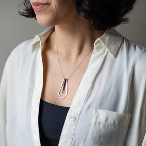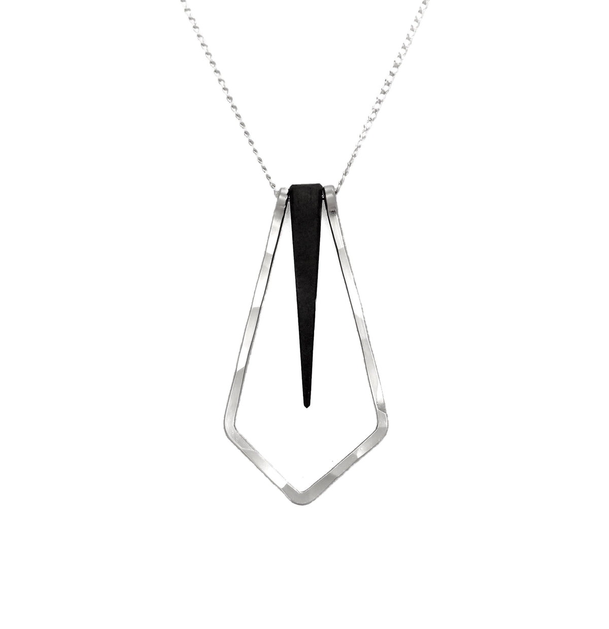 Hand-cut spike of ebony suspended within a diamond of sterling silver wire.